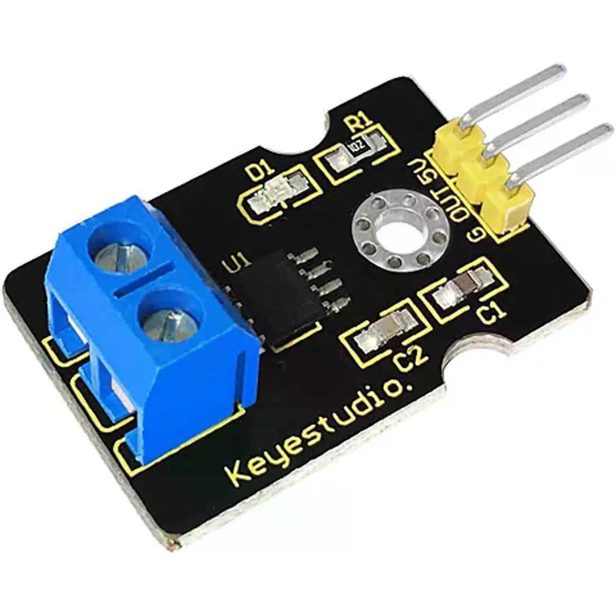 O sensor de corrente ACS712-20A é utilizado para medir a intensidade da corrente. Contém o chip ACS712ELC-20A, baseado no Efeito Hall. Deve-se protegê-lo da influência de campos magnéticos durante o seu uso.