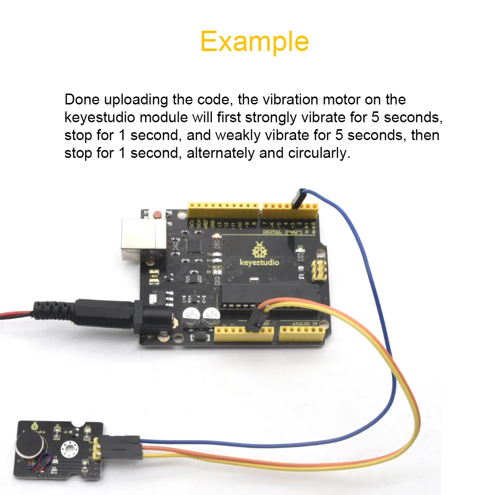 Este módulo utiliza um motor de vibração de alta qualidade e padrão. Podemos controlar directamente a vibração do motor utilizando o pino digital do microcontrolador Arduino - nível HIGH para activar; nível LOW para desactivar. Também é possível controlar a intensidade da vibração do motor através dos pinos PWM do Arduino.