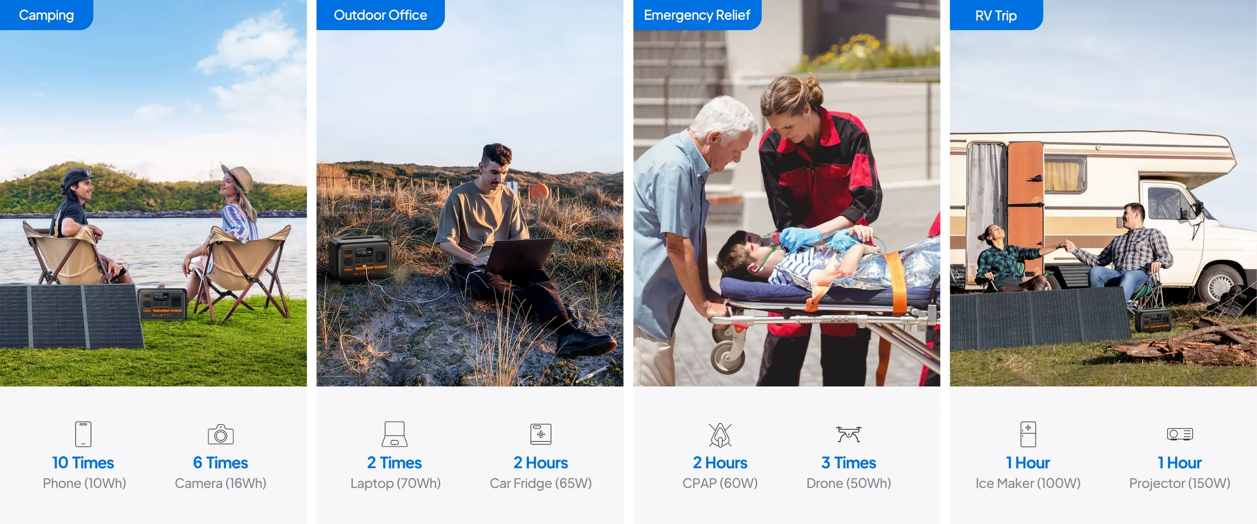 - Tempo de recarga (painel solar 200 W): aprox. 1,5 h (com sol intenso, boa orientação e baixa temperatura)