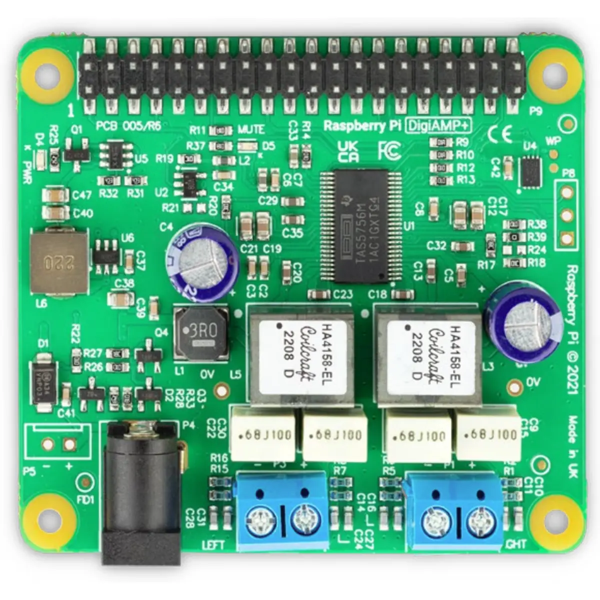 O DigiAMP+ utiliza o Power DAC TAS5756M da Texas Instruments para fornecer ligação direta a colunas estéreo passivas com potência até 2x35 W, com saída variável. É a placa ideal para um projeto HiFi baseado num Raspberry Pi!
