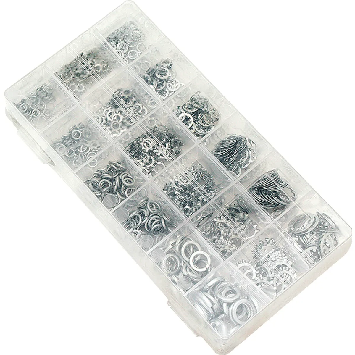 O conjunto inclui uma vasta gama de anilhas de mola e dentadas (internas e externas) organizadas numa prática caixa transparente com tampa de fecho. O conjunto é adequado tanto para uso doméstico como para oficinas e serviços técnicos. As anilhas têm acabamento zincado, resistente à corrosão.