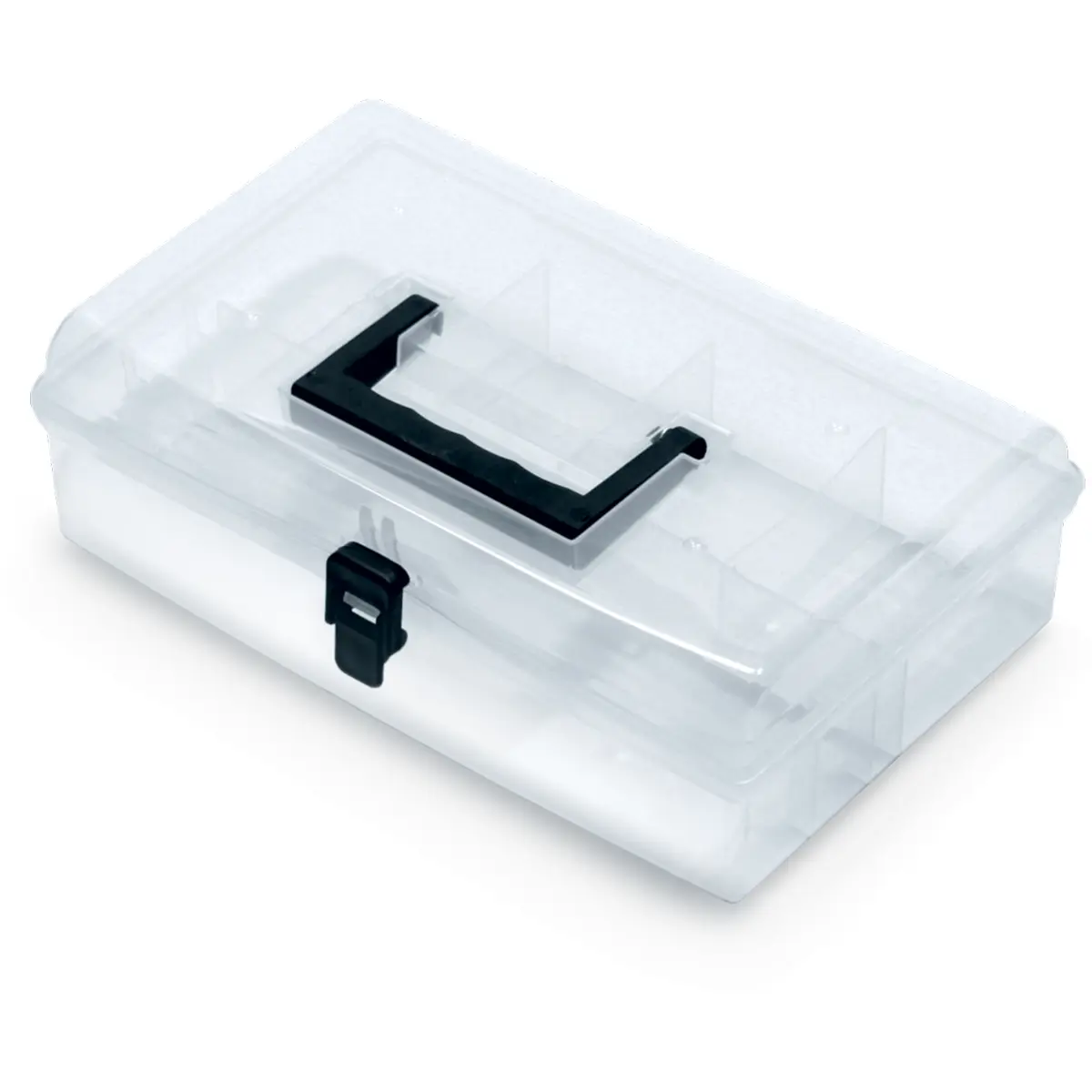 Caixa organizadora transparente com cinco compartimentos, dimensionalmente de 295x195x85 mm, com tampa transparente, corpo em polipropileno e fecho resistente. Possui pega ergonómica para transporte rápido e fácil. Ideal para guardar peças de bricolagem, materiais de pesca e uso doméstico, mantendo o conteúdo visível e acessível em qualquer situação. Excelente para organização de pequenas peças, ferramentas e acessórios, oferecendo durabilidade e praticidade no dia a dia, mesmo em ambientes exigentes.