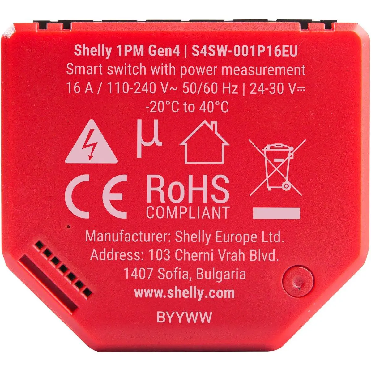O Shelly 1PM Gen4 é um interruptor inteligente compacto com medição de potência integrada, ideal para controlo remoto e monitorização de consumos de eletrodomésticos, luzes, ventiladores ou outros dispositivos até 16 A. Suporta conectividade Wi-Fi, Zigbee, Bluetooth e é compatível com Matter.