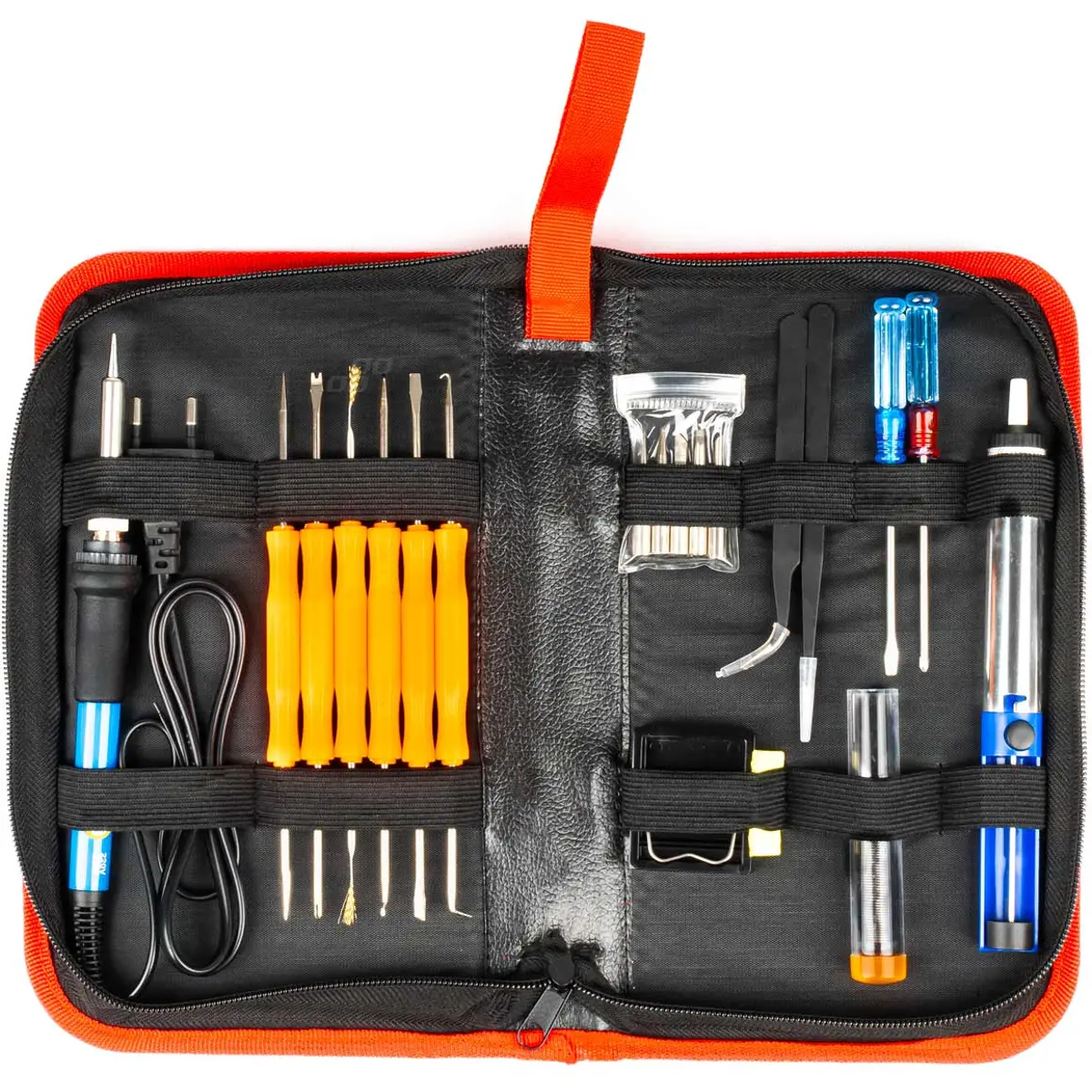 - Inclui suporte para ferro de soldar, pontas de solda substituíveis, fio de solda, chave de fendas e ferramentas de soldadura