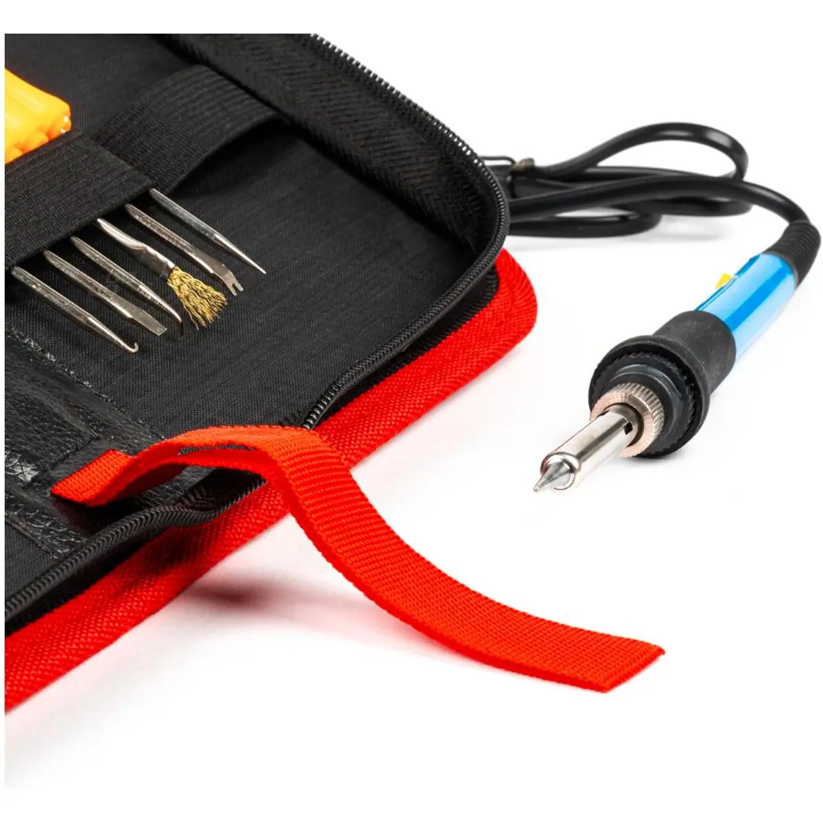 Kit de soldadura completo com ferro de soldar de 60 W e controlo de temperatura ajustável entre 200 e 450°C, ideal para unir aço, zinco e cobre em trabalhos de eletrónica e bricolage. Inclui 20 componentes organizados numa mala de transporte prática e compacta, suporte para ferro, 5 pontas de solda substituíveis, fio de solda, pinças de precisão, ventosa de dessoldagem, chaves de precisão e ferramentas de dupla face para eletrónica. O conjunto permite trabalhar em componentes de pequena dimensão com conforto, organização e segurança.