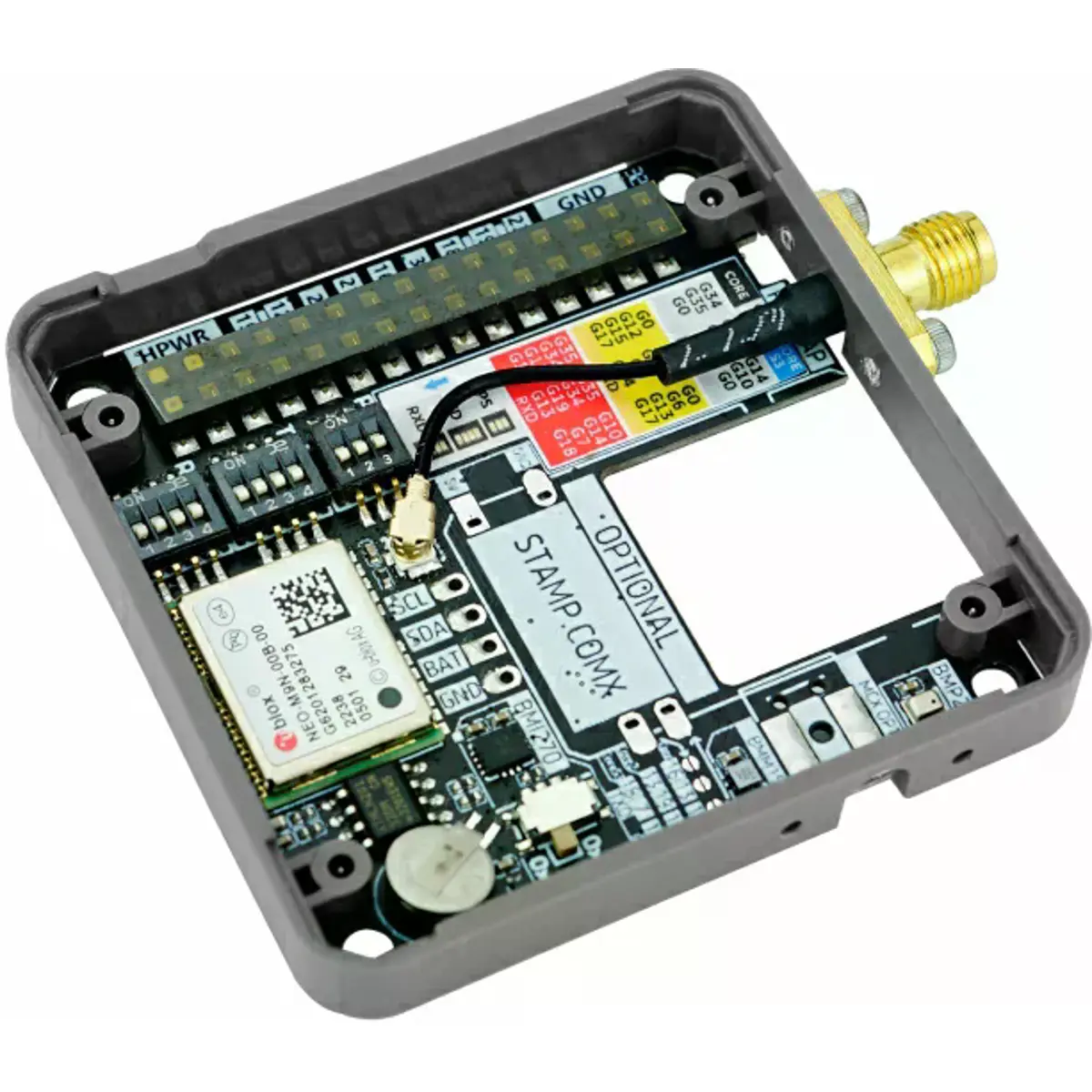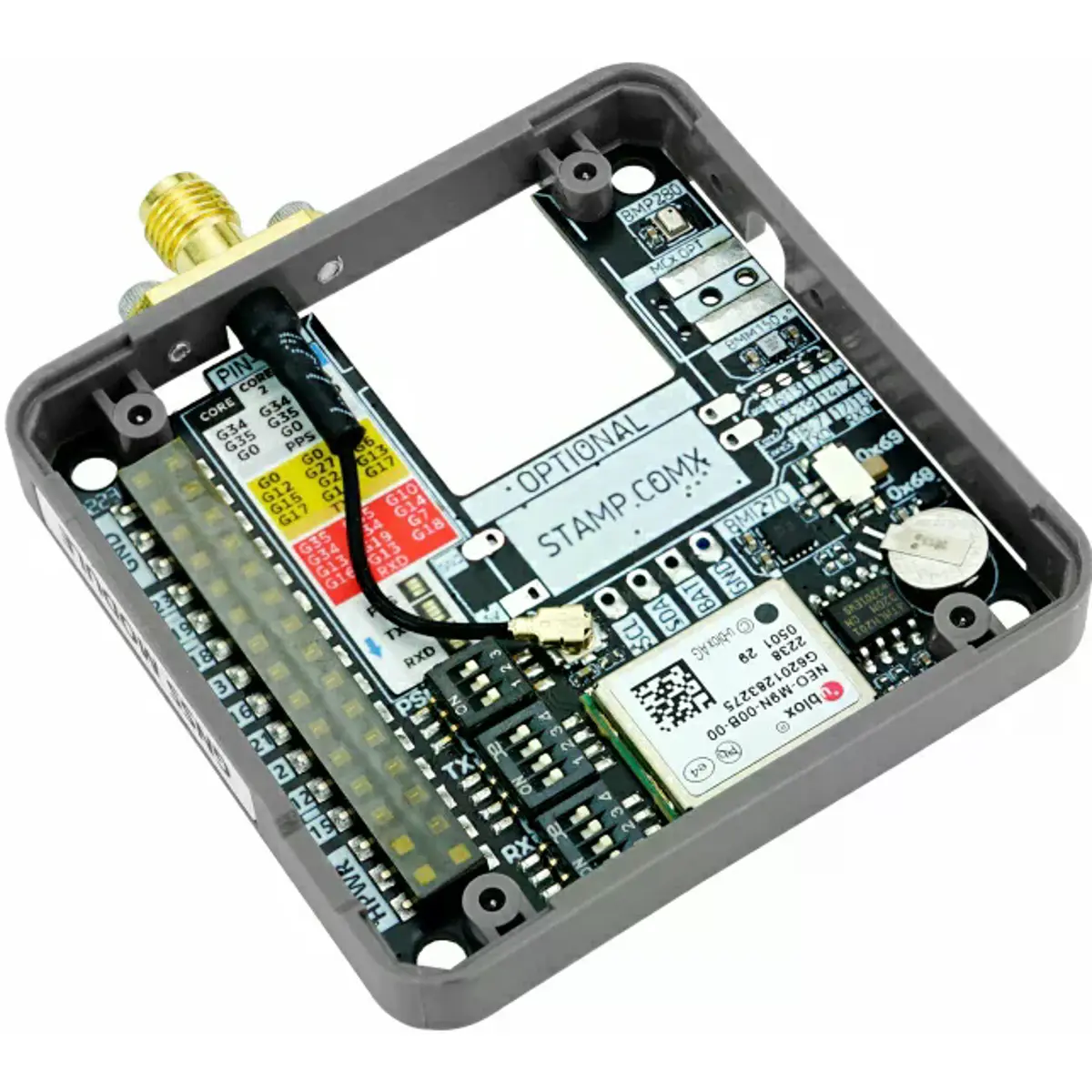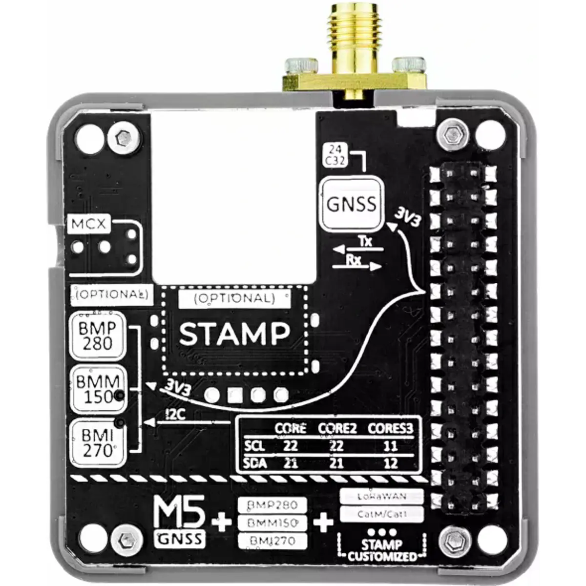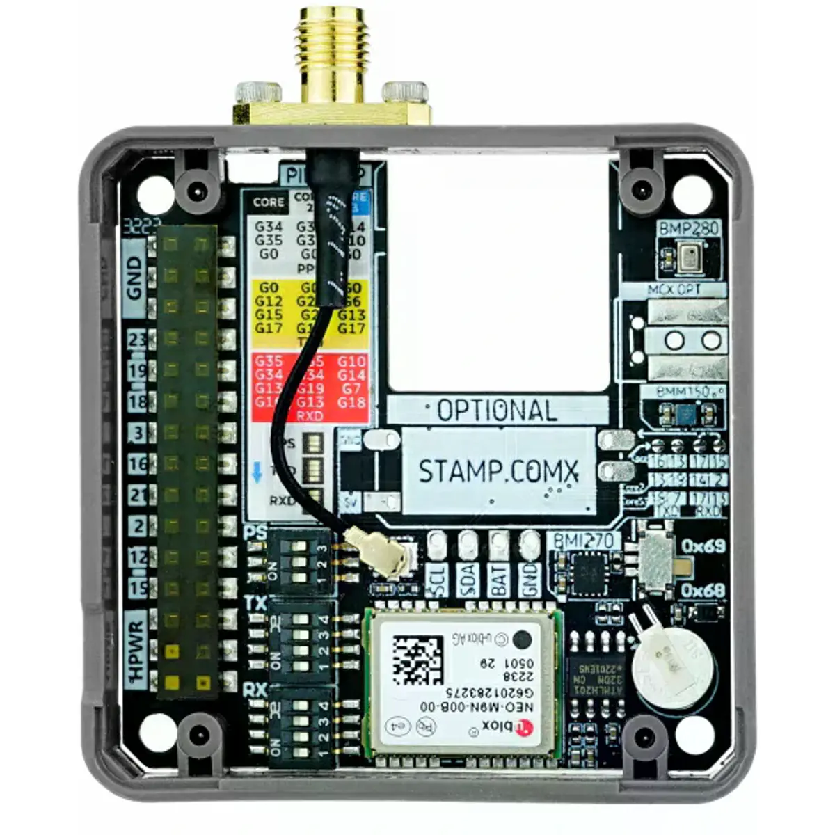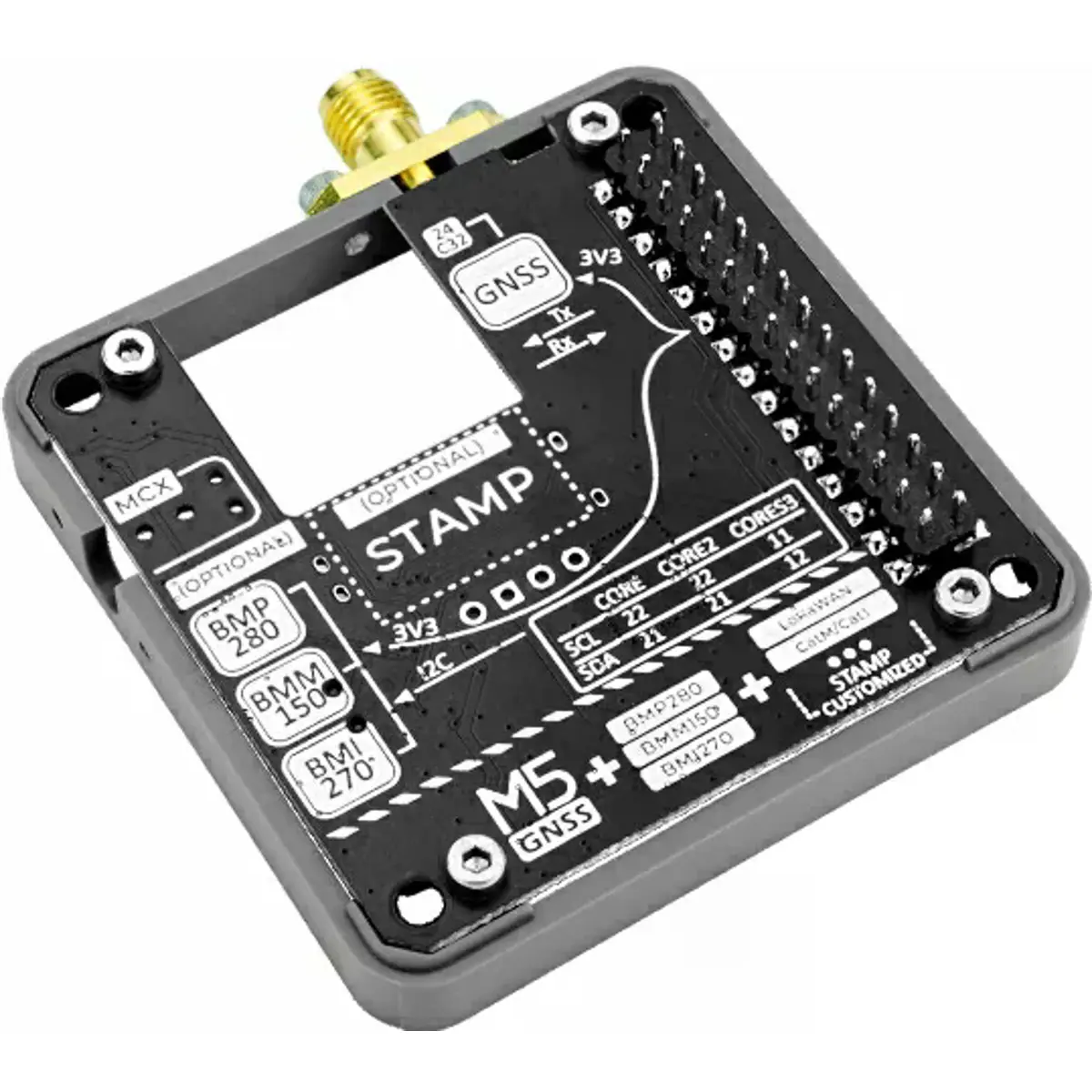 O Module GNSS é um módulo multifuncional de comunicação e posicionamento global, equipado com o módulo de posicionamento de alta precisão NEO-M9N-OOB, suportando receção de múltiplos sinais de satélite. Integra também um sensor de atitude de seis eixos BMI270, um magnetómetro de três eixos BMM150 e um sensor de pressão barométrica, permitindo a medição completa de localização, orientação, altitude e outras informações geográficas. O módulo inclui slots de expansão reservados para a série M5Stamp, possibilitando funcionalidades adicionais de comunicação IoT. É indicado para aplicações em posicionamento e navegação, agricultura, logística, levantamento geográfico, monitorização ambiental, entre outras.