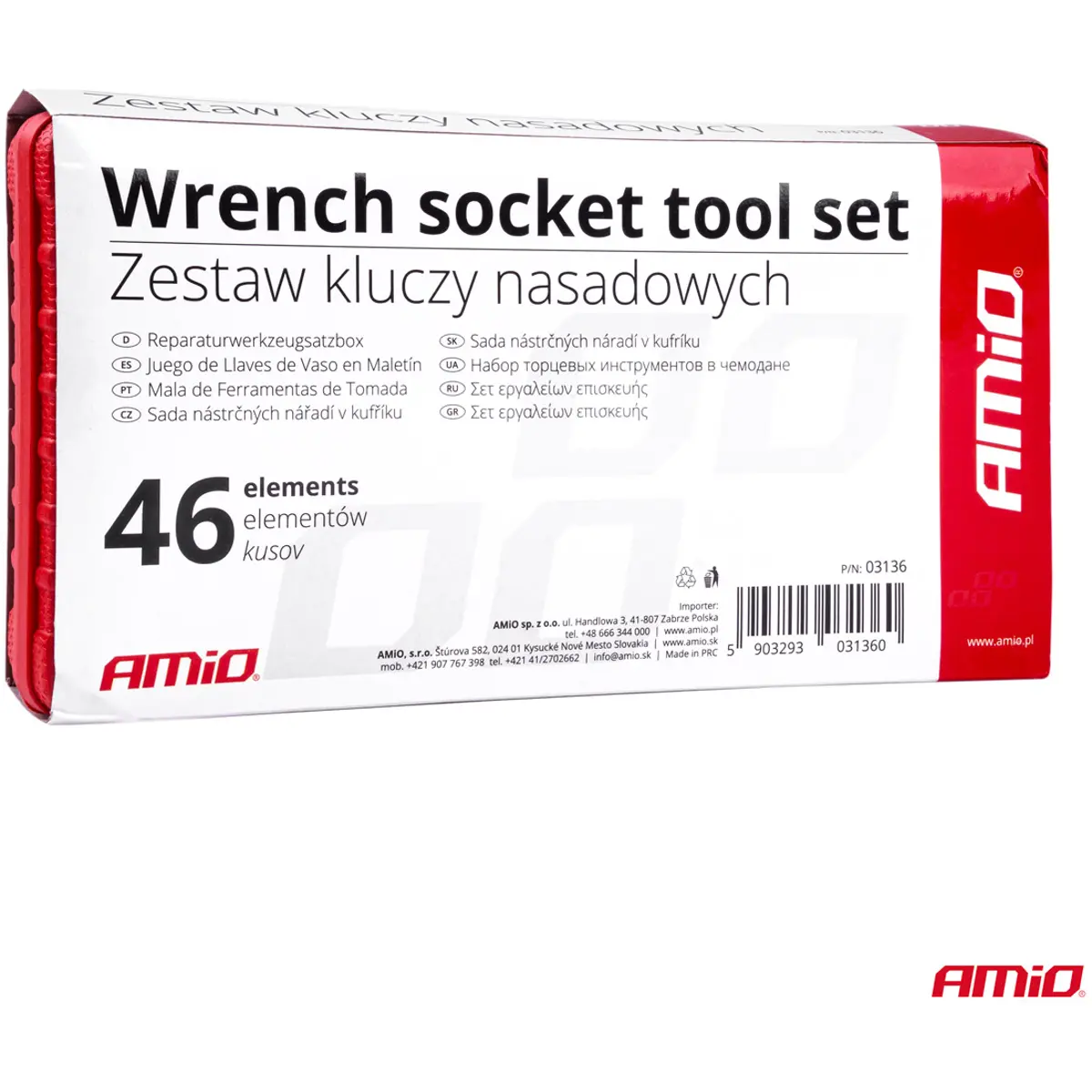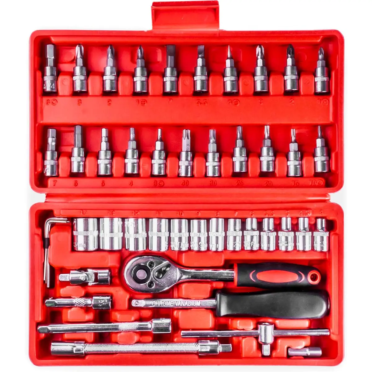 Conjunto completo de chaves de caixa com 46 peças, fabricado em aço cromo-vanádio de alta qualidade, ideal para trabalhos mecânicos, domésticos e de bricolage. As ferramentas são organizadas numa mala prática e resistente, adequada tanto para uso profissional como amador. As peças são endurecidas e identificadas com as medidas para facilitar o uso.