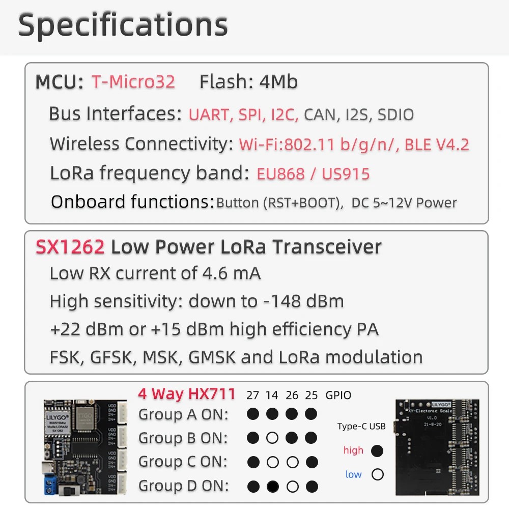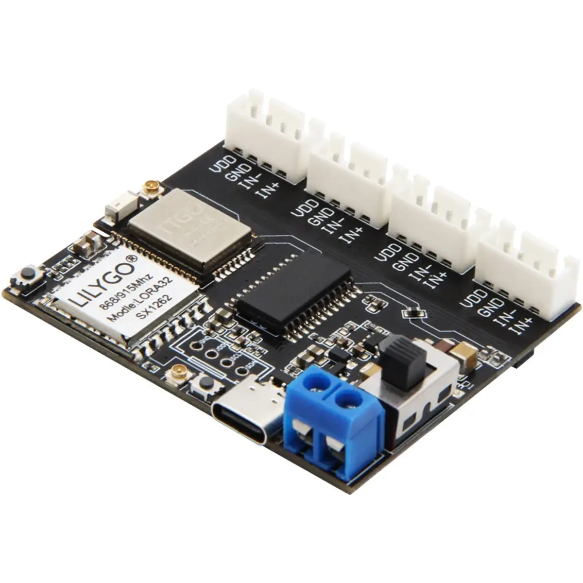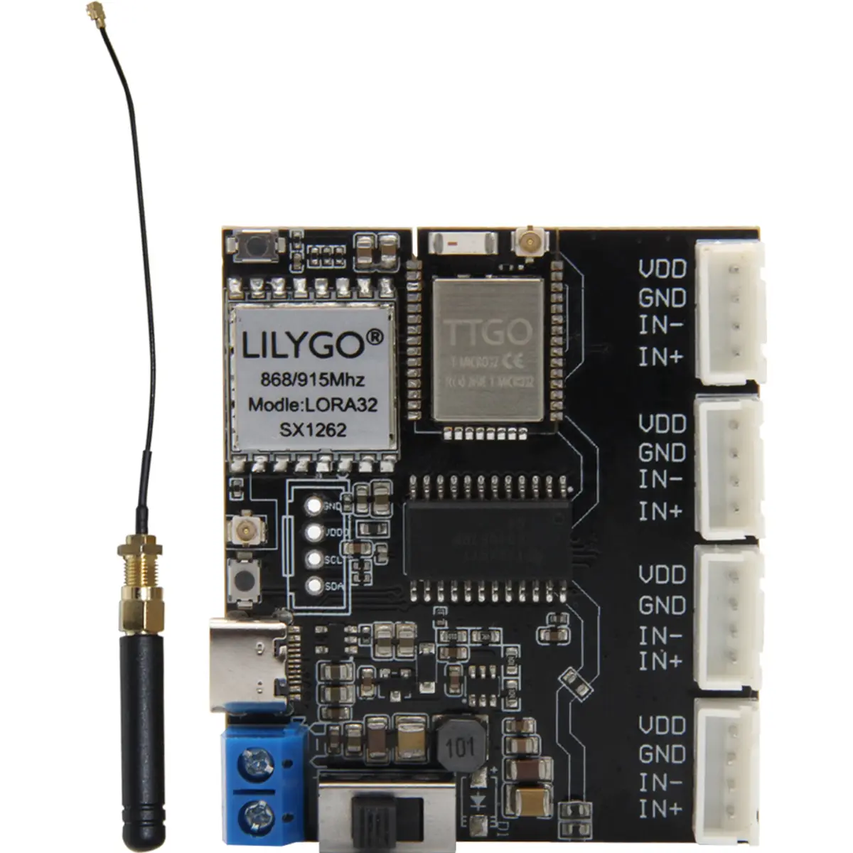 O LilyGo TTGO T-Weigh 868MHz [H522] é um módulo baseado no microcontrolador ESP32 (T-Micro32), que integra 4 chips HX711 (amplificadores de sinal de células de carga com conversão analógico-digital), permitindo a leitura de dados de até quatro sensores de peso externos. Com conectividade LoRa (SX1262), Wi-Fi e Bluetooth, este módulo é ideal para aplicações de monitorização remota de peso, como em logística, gestão de inventário e agricultura inteligente. A comunicação sem fio através de LoRa permite a transmissão de dados a longas distâncias, enquanto o Wi-Fi e o Bluetooth oferecem opções de conectividade local.