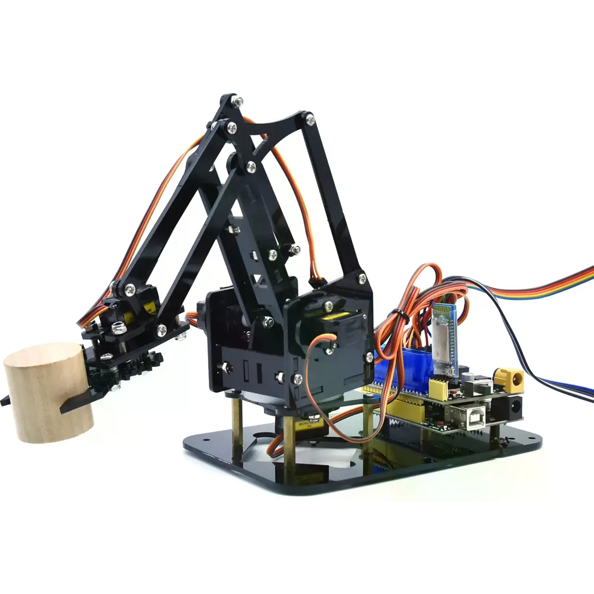Kit de braço robótico 4DOF compatível com Arduino. Estrutura em acrílico resistente e controlo com quatro eixos, permitindo movimentos precisos por dois módulos joystick analógicos incluídos, ou via Bluetooth com aplicação móvel, ou ainda por comando PS2 (não incluído). Inclui placa controladora V4.0 com interface PS2 compatível, duas saídas de 5V (3A) e alimentação de 7-15 V DC, além de instruções detalhadas de montagem e calibração. Compatível com Arduino IDE, ideal para iniciação à robótica educativa, promovendo raciocínio lógico, observação e aprendizagem prática.