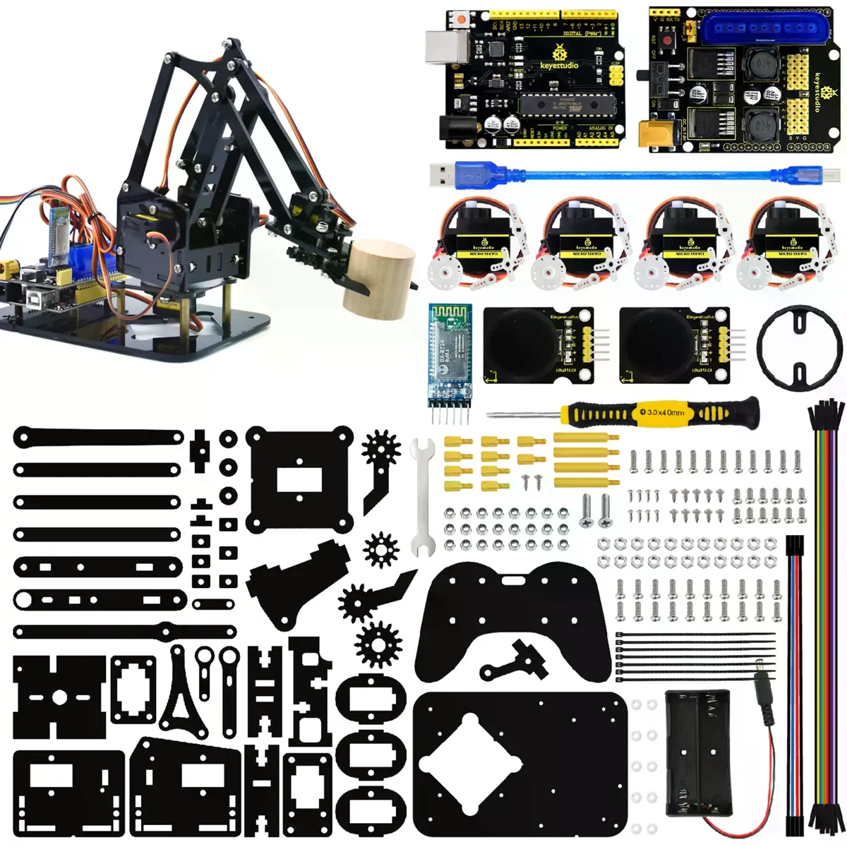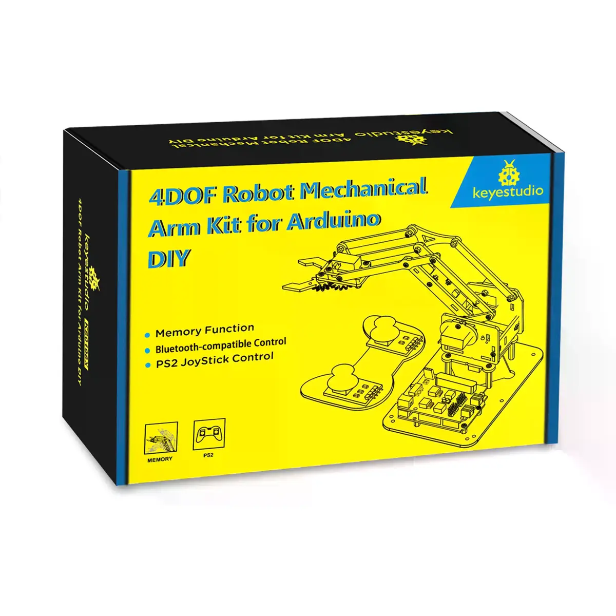 O kit de braço robótico 4DOF da Keyestudio foi desenvolvido para promover a aprendizagem prática, o raciocínio lógico e a capacidade de observação em crianças e jovens. Com estrutura em acrílico e montagem facilitada, é um excelente projeto introdutório para robótica com Arduino.
