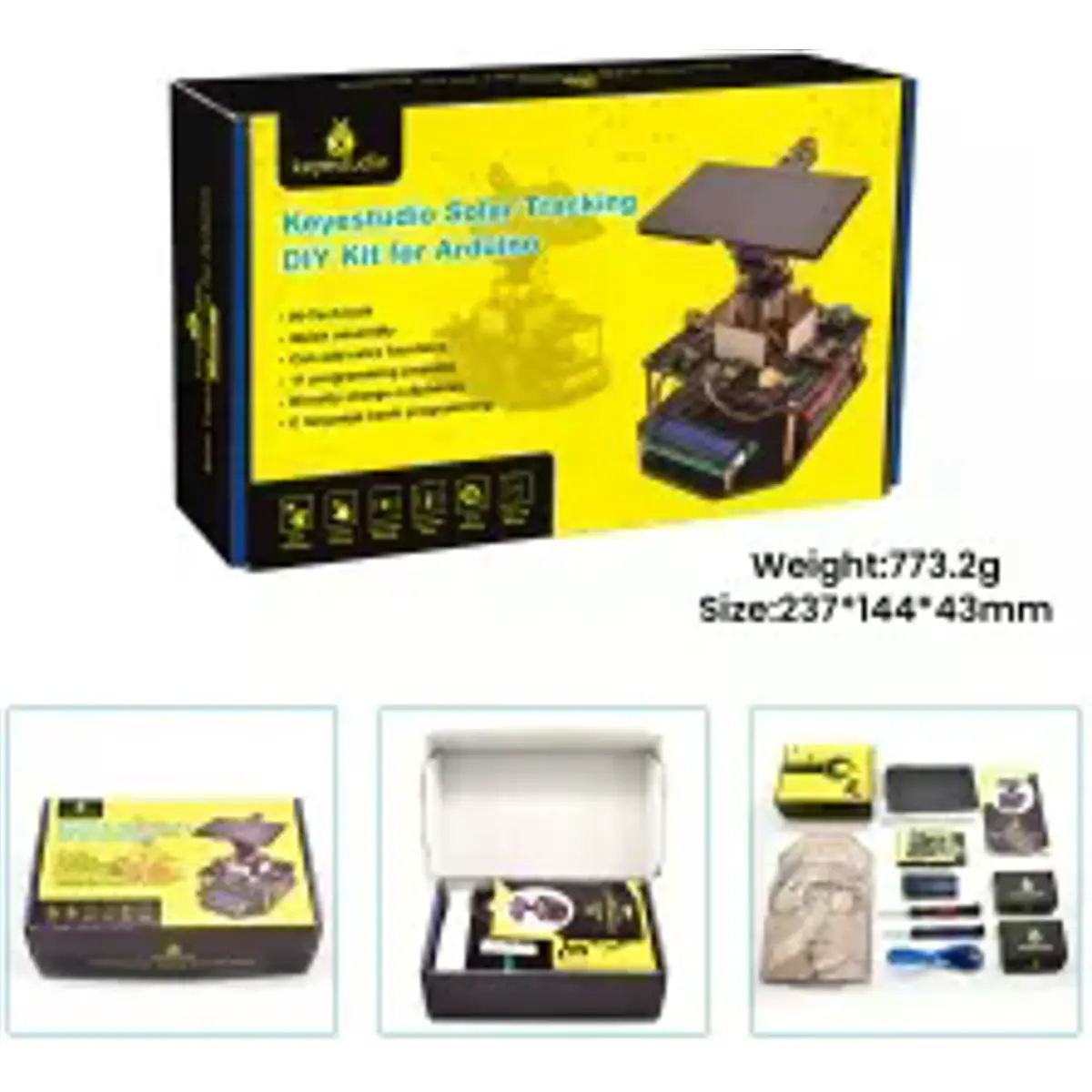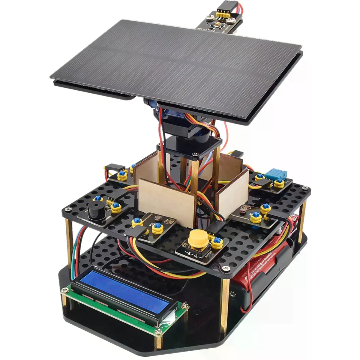 O Kit de Rastreamento Solar da Keyestudio é um sistema educativo baseado em Arduino, concebido para ensinar os princípios da programação, eletrónica e energias renováveis. Através de sensores e servos, o painel solar ajusta automaticamente a sua posição para maximizar a captação de luz, permitindo carregar pequenos dispositivos por energia solar.