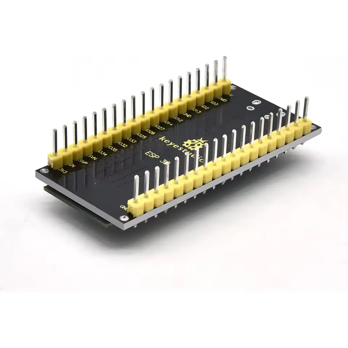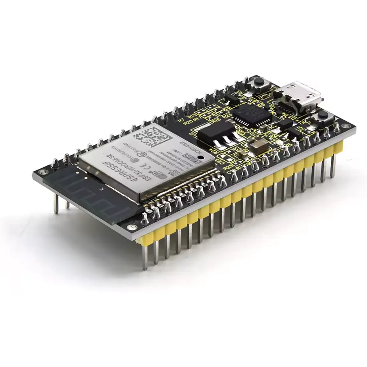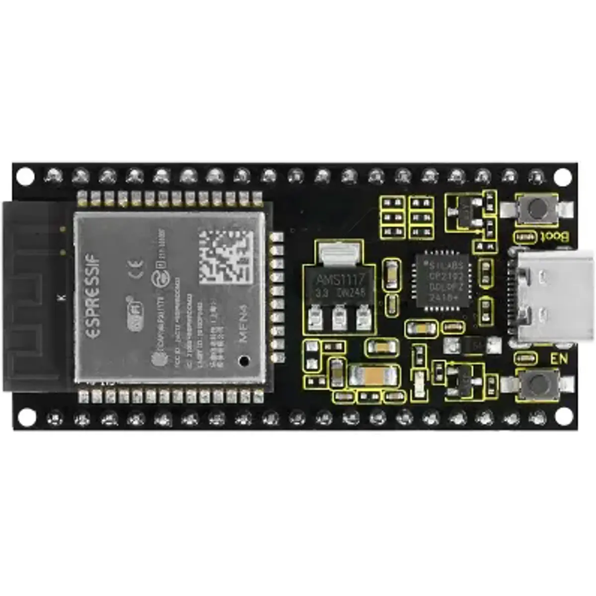 Placa de desenvolvimento compacta baseada no módulo ESP32-WROOM-32D, ideal para projetos de conectividade sem fios. Suporta Wi-Fi, Bluetooth Clássico e BLE, com headers standard de 2,54 mm em ambos os lados, facilitando a ligação de periféricos externos e a prototipagem.