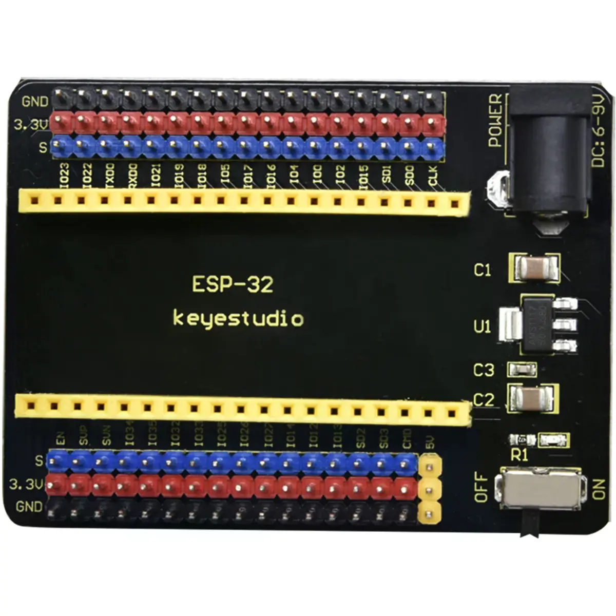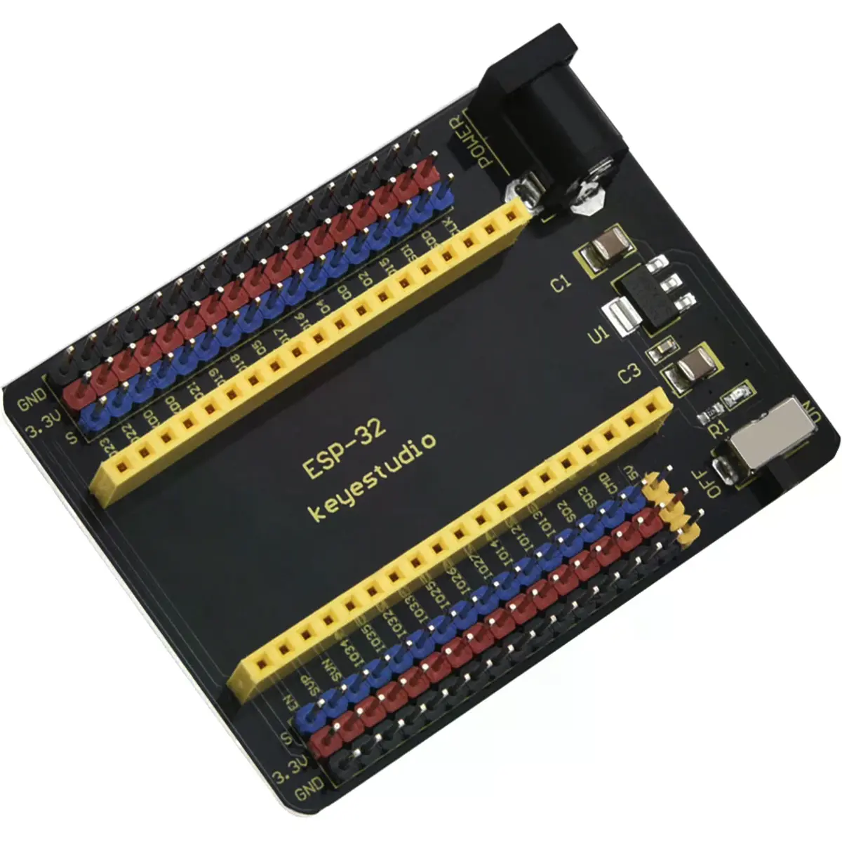 Este shield foi desenvolvido para ser totalmente compatível com a placa principal ESP32 Core. Permite o acesso a todos os pinos da placa ESP32 através de conectores tipo header de 2.54 mm, facilitando a ligação de sensores e módulos externos. Inclui ainda circuito de alimentação dedicado e DIP switch para controlo de energia.