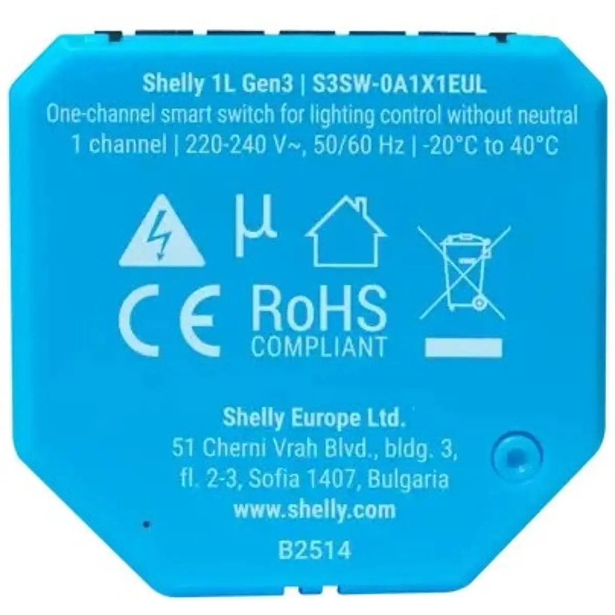 O Shelly 1L Gen3 é um interruptor inteligente de um canal, concebido especialmente para instalações de iluminação onde não existe fio neutro. Compatível com a maioria dos interruptores de parede, permite o controlo remoto da iluminação sem necessidade de reestruturação elétrica. Compacto, versátil e fácil de instalar, integra-se facilmente em sistemas de automação residencial via Wi-Fi ou Bluetooth. Inclui proteção contra sobreaquecimento e permite atualizações OTA. O Shelly 1L Gen3 é compatível com Matter e vem com um Shelly Bypass 1L/2L incluído para permitir o funcionamento com cargas LED.