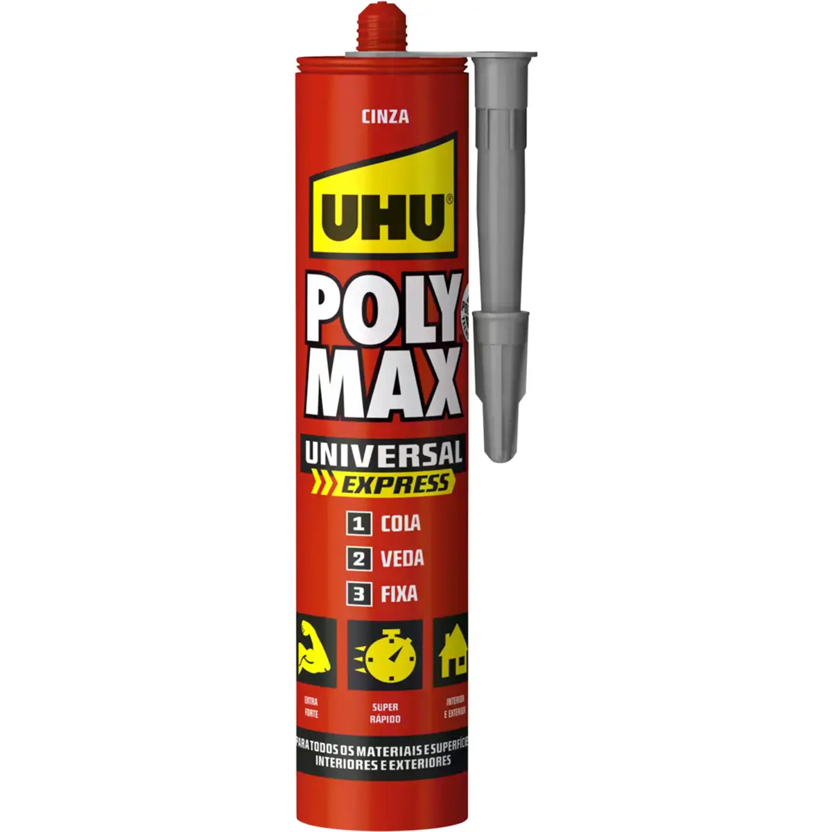Poly Max® Universal Express Cinzento: cola e veda de montagem universal à base de tecnologia SMP exclusiva. Ideal para colar, fixar e vedar praticamente todos os materiais de construção em superfícies lisas, porosas e não porosas. Extra forte, elástico e de secagem rápida, pode ser aplicado em interiores e exteriores, incluindo debaixo de água.