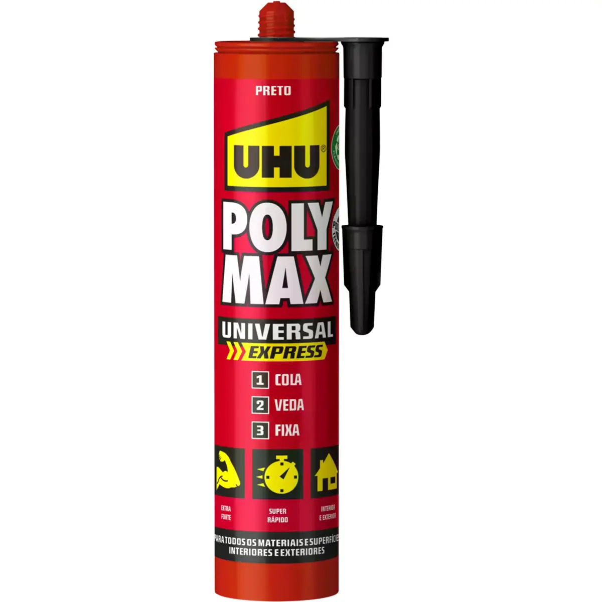 Poly Max® Universal Express Preto: cola e veda de montagem universal com base na tecnologia SMP exclusiva. Adequada para colar, fixar e vedar quase todos os materiais de construção em diferentes superfícies (lisas, porosas e não porosas). Extra forte e de secagem rápida. Pode ser usada em interiores, exteriores e até debaixo de água.