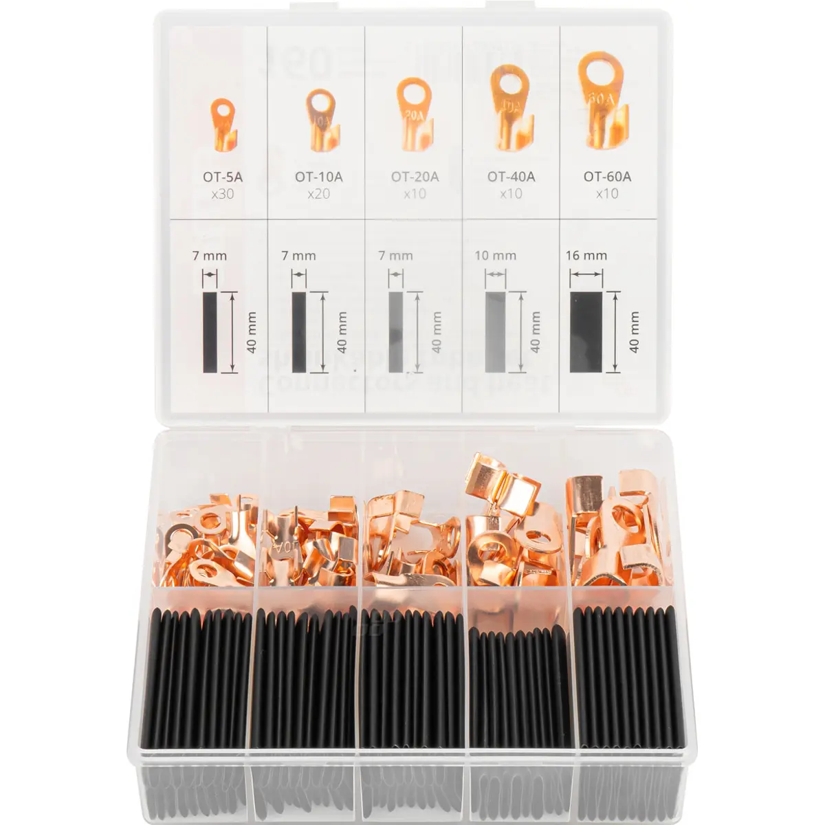 Conjunto de terminais em cobre com mangas termo-retráteis para ligações elétricas seguras, duráveis e protegidas. Inclui terminais abertos com abas para cravação versátil, oferece isolamento adicional, proteção contra corrosão, humidade e danos mecânicos, com várias dimensões para diferentes aplicações. A instalação é fácil e rápida com cravagem e aplicação de calor, e vem numa caixa organizadora prática e portátil. Ideal para profissionais e entusiastas que procuram conectores de alto desempenho com estabilidade eléctrica.