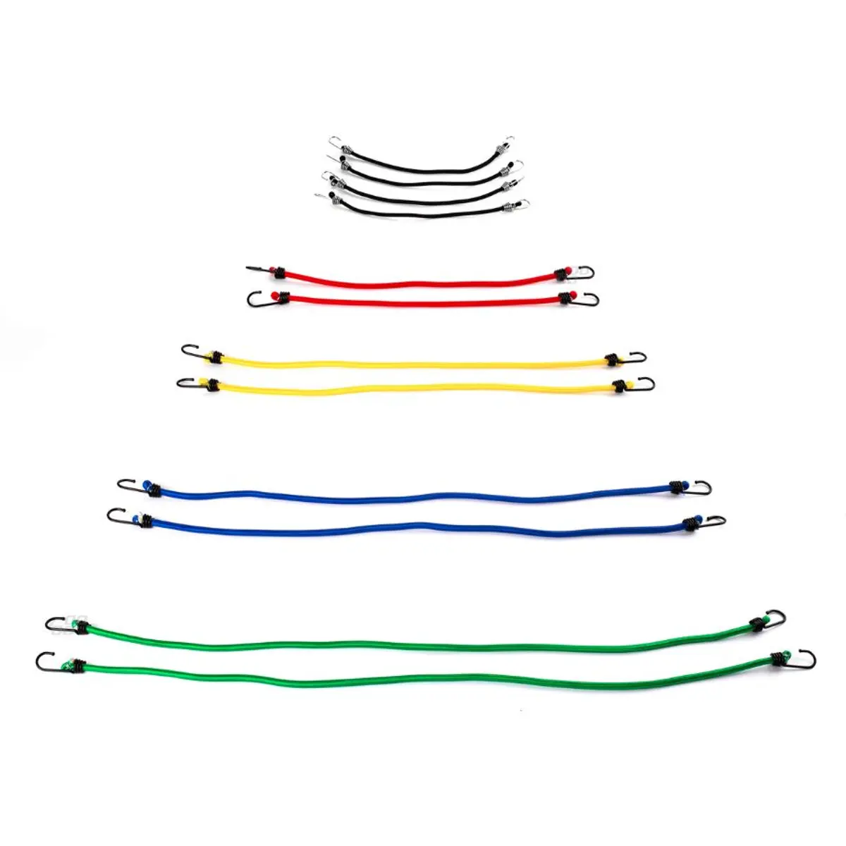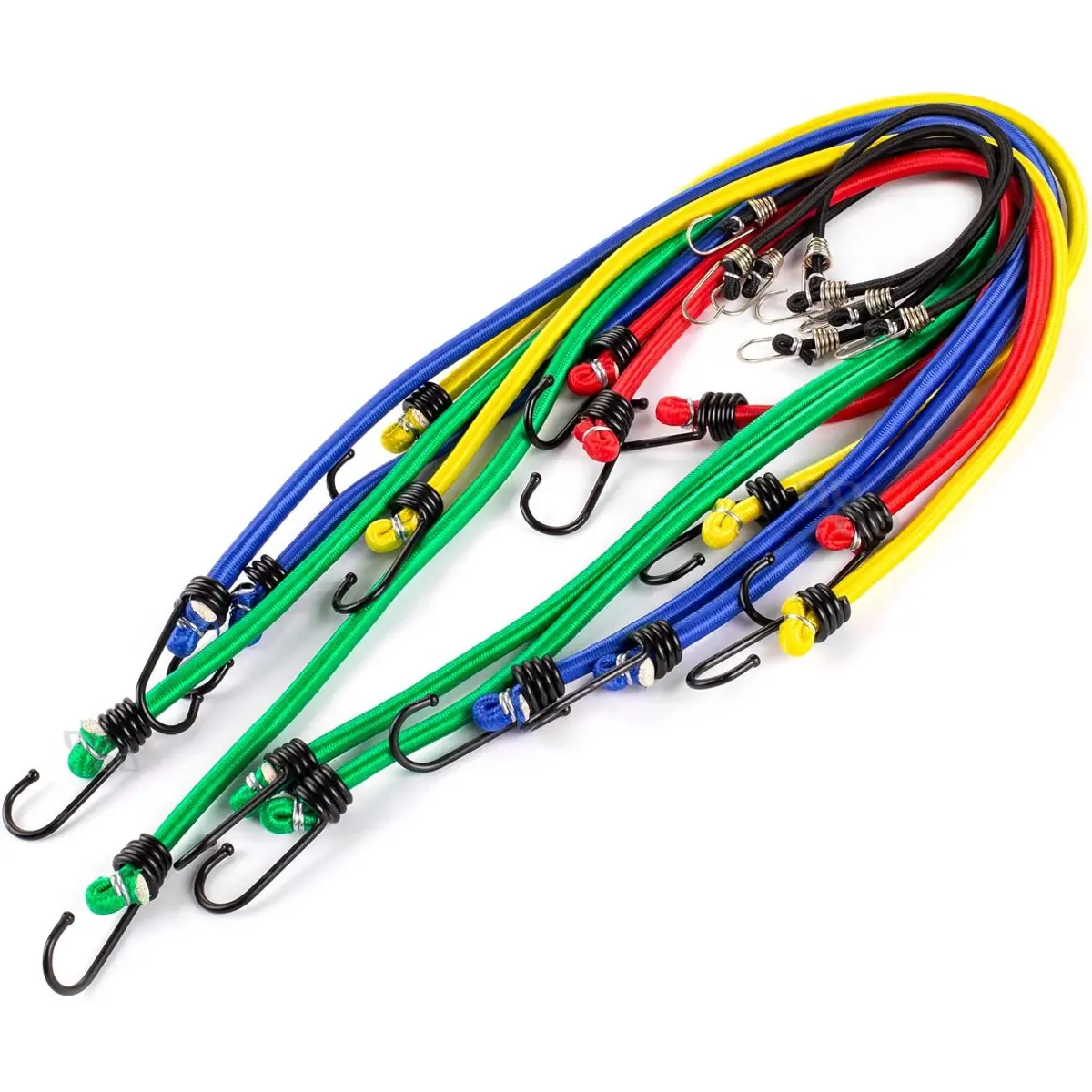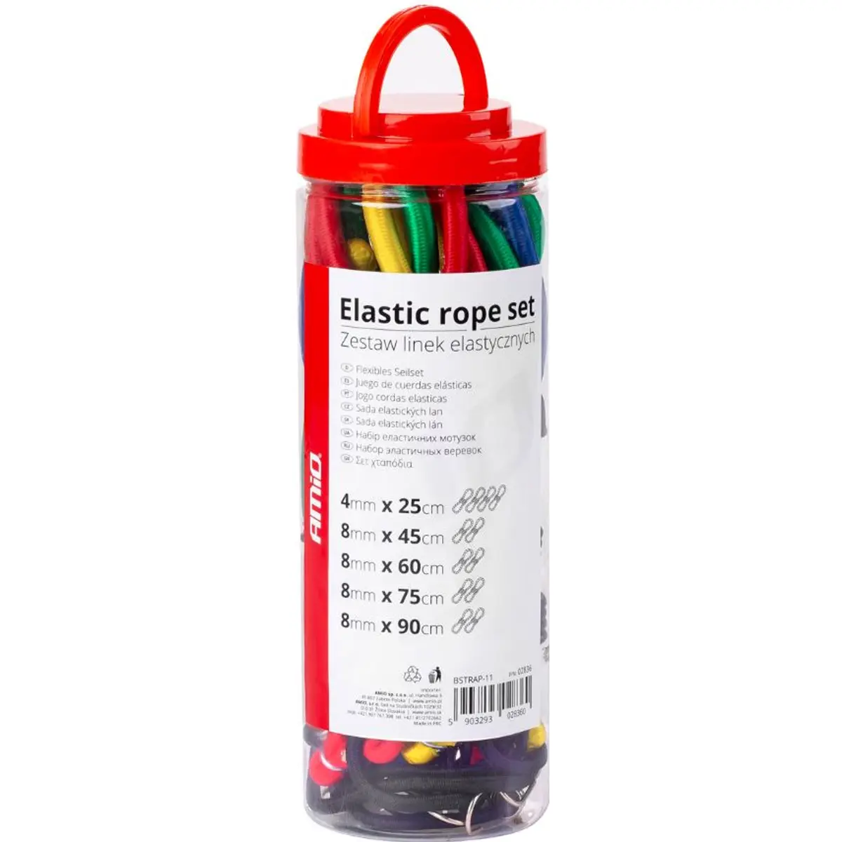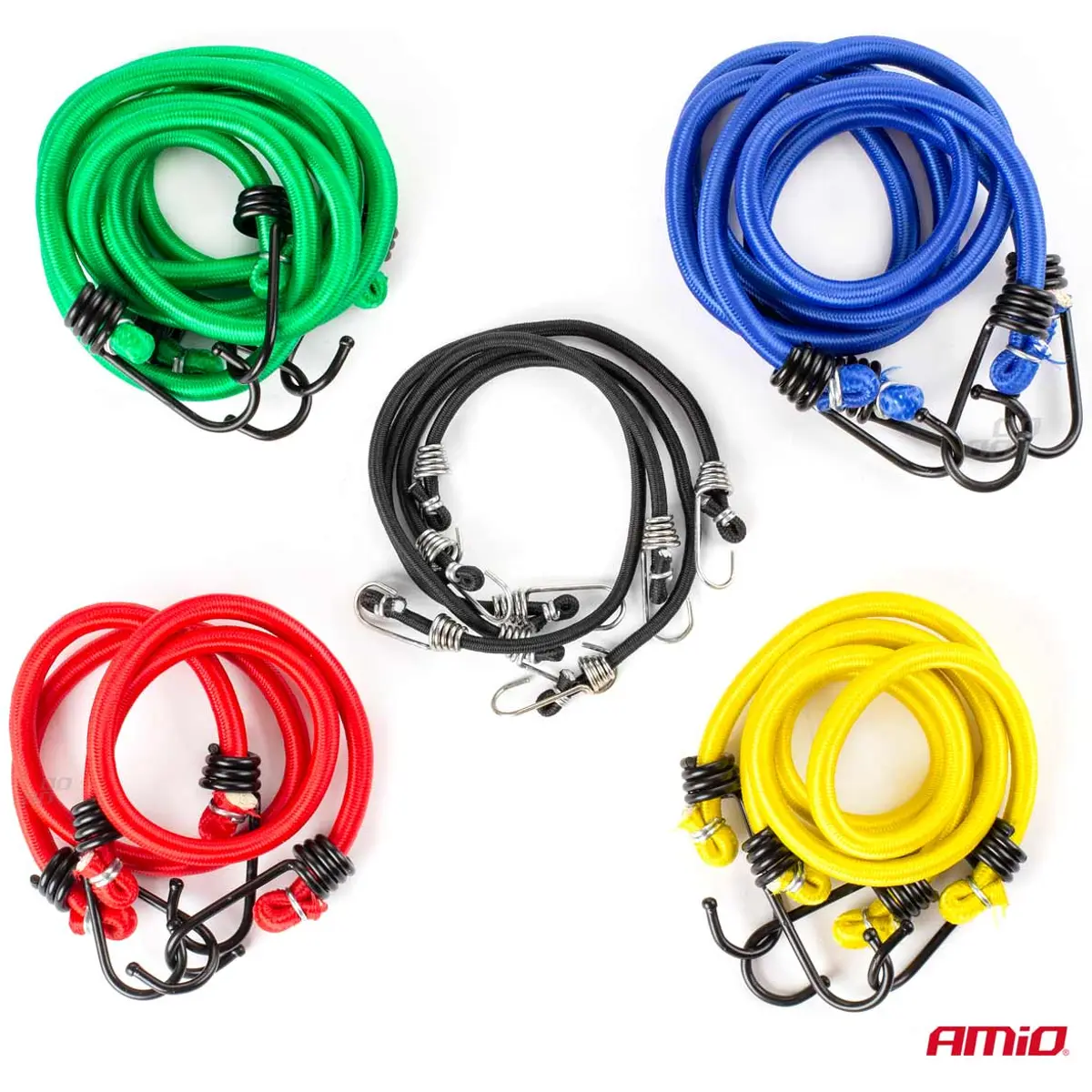 Conjunto de cordas elásticas de alta resistência, ideais para fixação de cargas, uso automóvel, campismo ou aplicações gerais de transporte. Fabricadas com núcleo elástico resistente e revestimento durável. Equipadas com ganchos metálicos em ambas as extremidades para fixação segura.