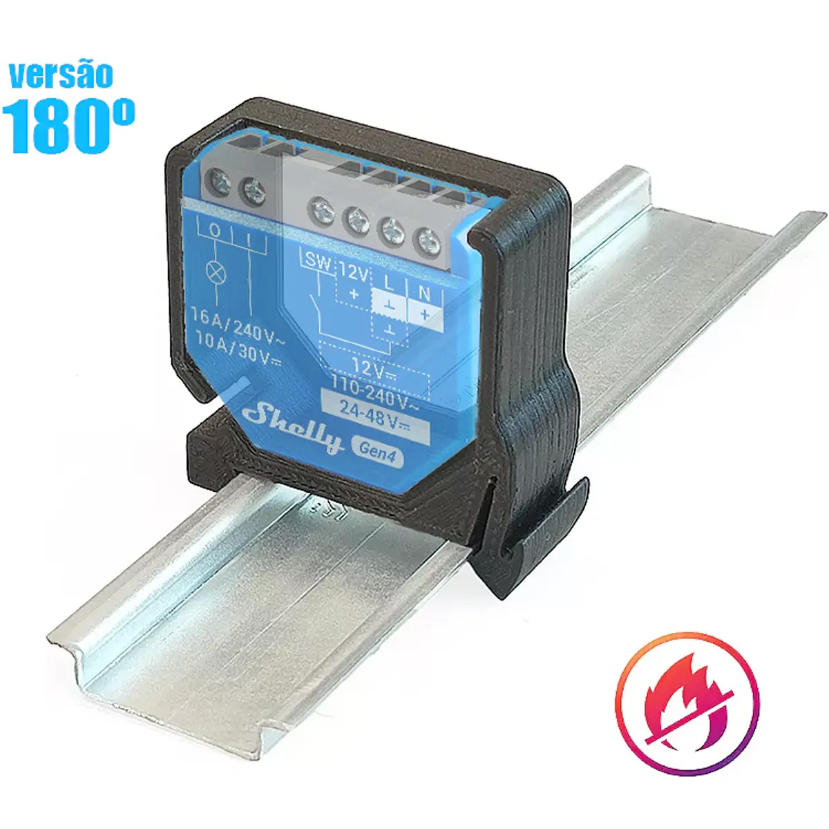 Suporte de calha DIN para montagem segura de módulos de automação da geração 4, com ângulo de instalação de 180°. Impressa em PETG auto-extinguível (UL94-V0) e acabamento preto, oferecendo resistência ao fogo. Compatível com os modelos Shelly 1 Gen4, Shelly 1PM Gen4 e Shelly EM Gen3. Ideal para organização de cabos em quadros elétricos, mantendo os componentes protegidos e com instalação estável.
