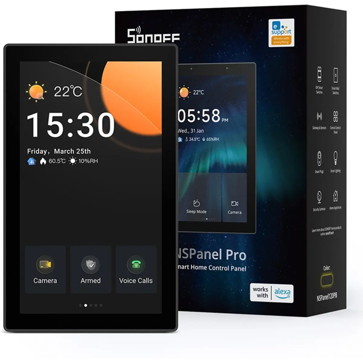 O SONOFF NSPanel Pro 120 é um painel de controlo inteligente multifuncional concebido para integrar e gerir dispositivos domésticos de forma intuitiva e centralizada. Com um ecrã tátil de 4,7", hub Zigbee 3.0 incorporado e compatibilidade com o protocolo Matter, este painel proporciona uma experiência fluida na gestão de iluminação, climatização, segurança, consumo energético, câmaras e muito mais. É possível criar widgets personalizáveis, modos de segurança, visualizar imagens ao vivo de câmaras IP, configurar termóstatos e realizar chamadas entre painéis ou com o smartphone.