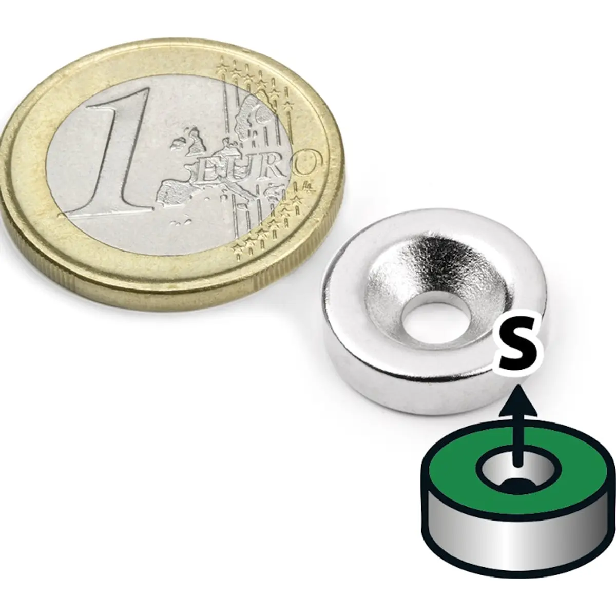 Ímanes de disco de neodímio com furação escareada e altura de 4 mm, que podem ser fixados com um parafuso de cabeça escareada. Este íman possui o polo Sul no lado da furação, permitindo a sua combinação com o íman 096-5919. Em conjunto, é especialmente indicado para uniões ocultas ou amovíveis em construção de móveis, design de interiores, montagem de stands, mobiliário comercial ou em dispositivos técnicos.