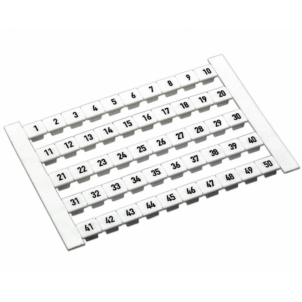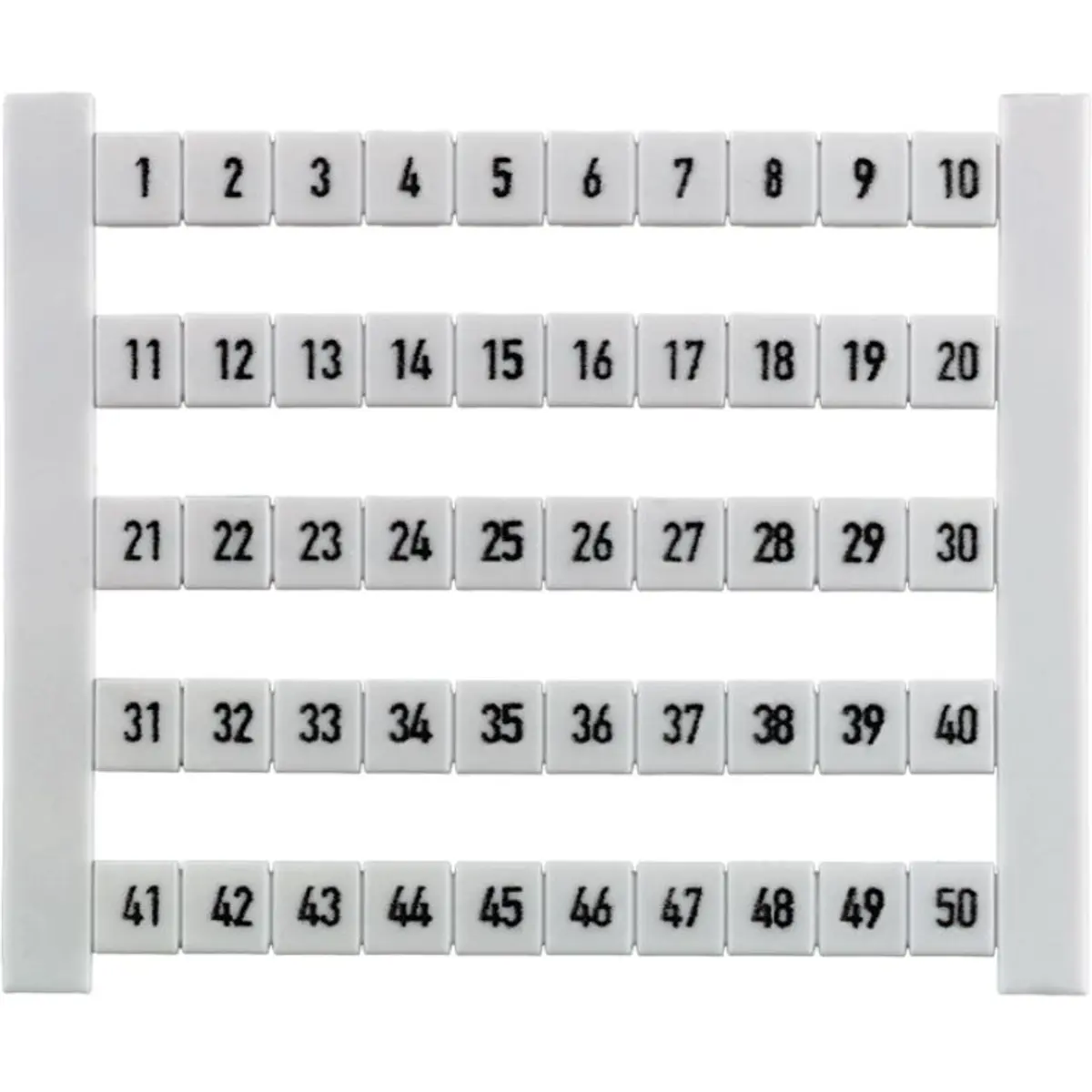 Marcador de bornes da gama Dekafix da Weidmueller, ideal para marcação clara e duradoura de bornes em aplicações elétricas. Compatível com vários tipos de bornes com passo de 6 mm. Fornecido em cartões com numeração de 1 a 50, com impressão horizontal a preto sobre fundo branco.