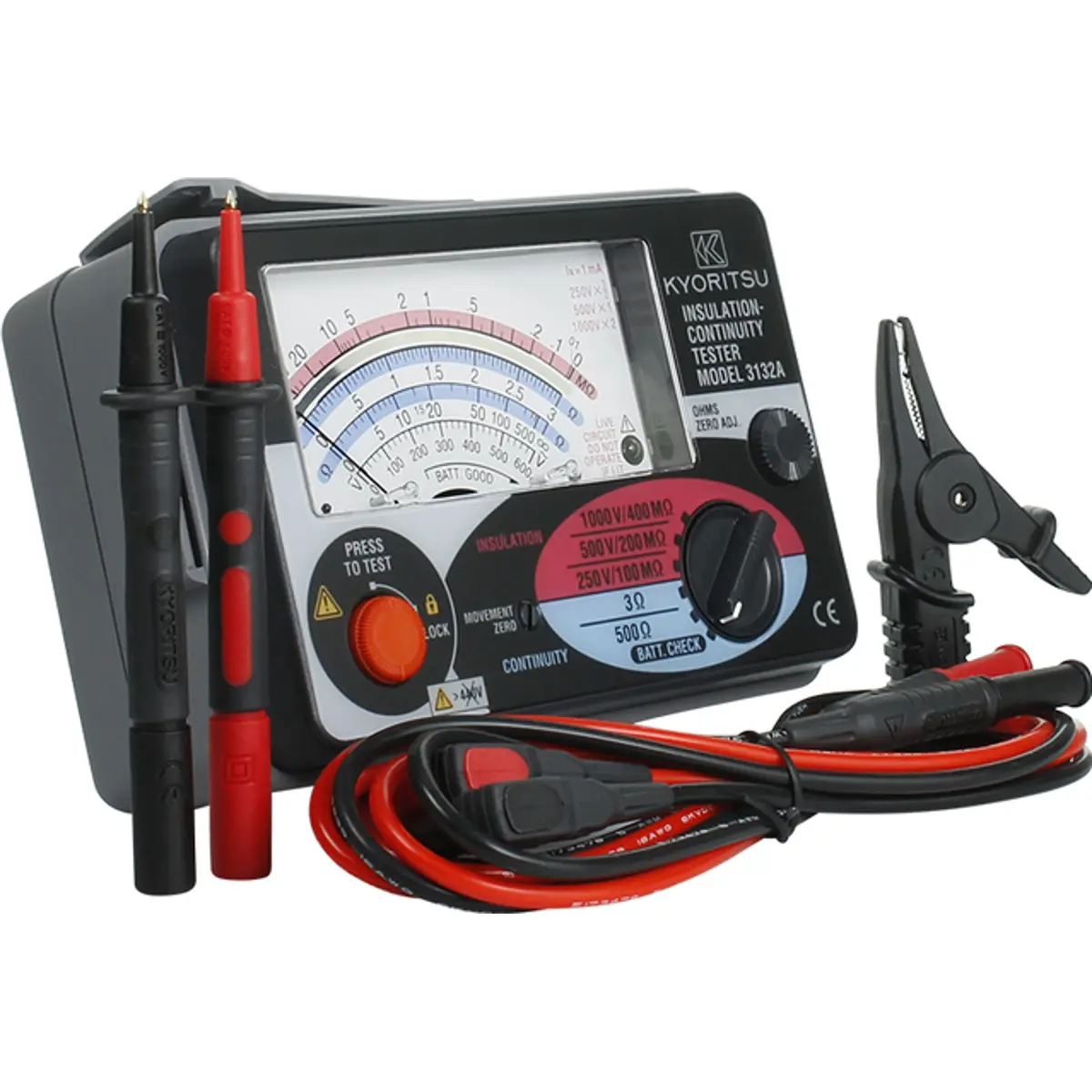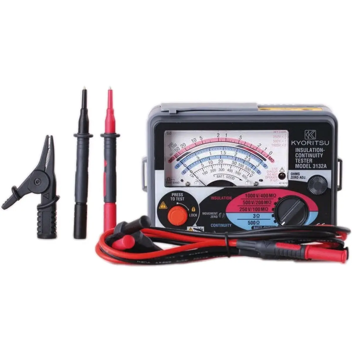 O medidor de isolamento analógico Kyoritsu 3132A é um testador compacto e de fácil utilização, projetado para medir a resistência de isolamento e testar continuidade. Com um design resistente à poeira e respingos (classificação IP54), este medidor é ideal para ambientes industriais e de construção. Oferece três faixas de teste de resistência de isolamento (250V, 500V e 1000V), bem como faixas de continuidade e resistência. Cumpre com os padrões de segurança IEC 61010-1 e IEC 61557, garantindo fiabilidade e segurança durante o uso.
