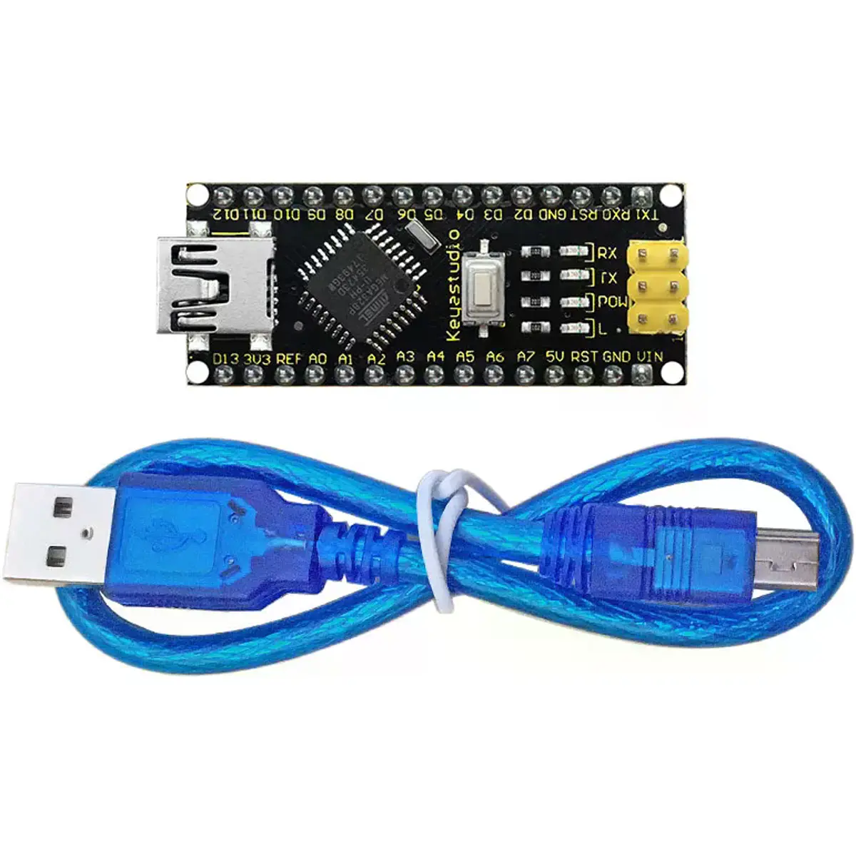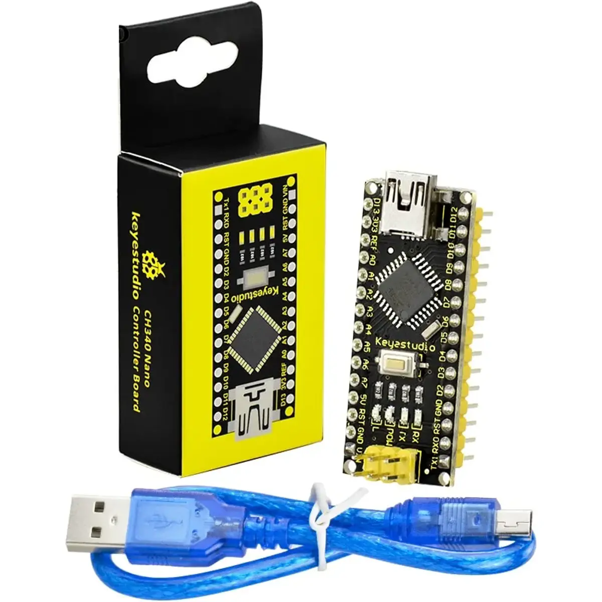 A Keyestudio Nano CH340 é uma placa compacta, completa e compatível com breadboards, baseada no microcontrolador ATmega328P-AU. Funciona de forma idêntica à ARDUINO NANO, com a diferença de utilizar o chip CH340G como conversor USB-Serial, o que requer a instalação de um driver específico.