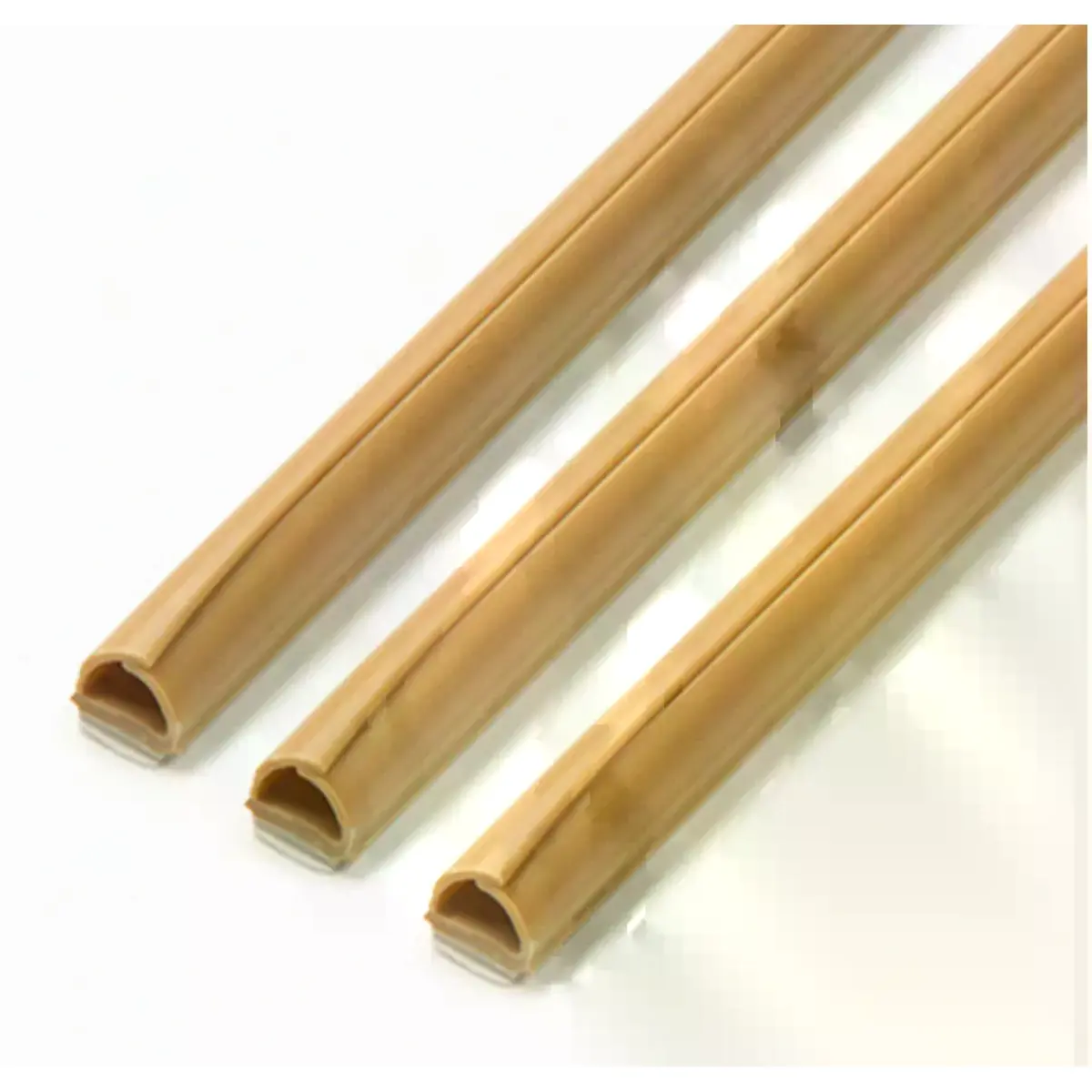 Calhas adesivas para cabos, com abas flexíveis, 10.5x10mm e 3x1m, na cor bege. Permitem instalação rápida sem ferramentas e corte com tesoura, adaptando-se a superfícies ligeiramente curvas. Em conformidade com ROHS e UNE-EN-60695, incluindo EN 60695-2-12 (750°C). Faixa de temperatura de serviço -5°C a +60°C.