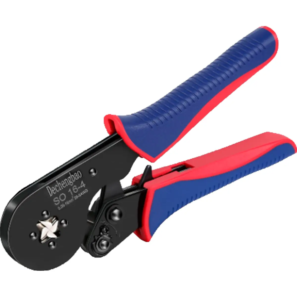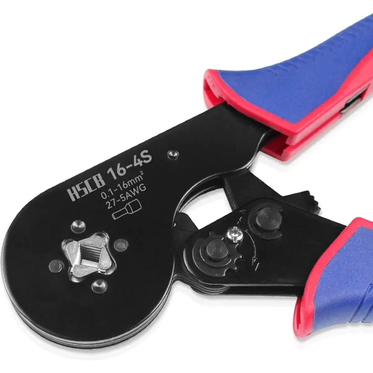 Alicate para apertar ponteiras isoladas ou não isoladas, com mecanismo autoajustável que adapta a forma da matriz ao tamanho da ponta e apertando-a simetricamente de 4 lados (quadrado).