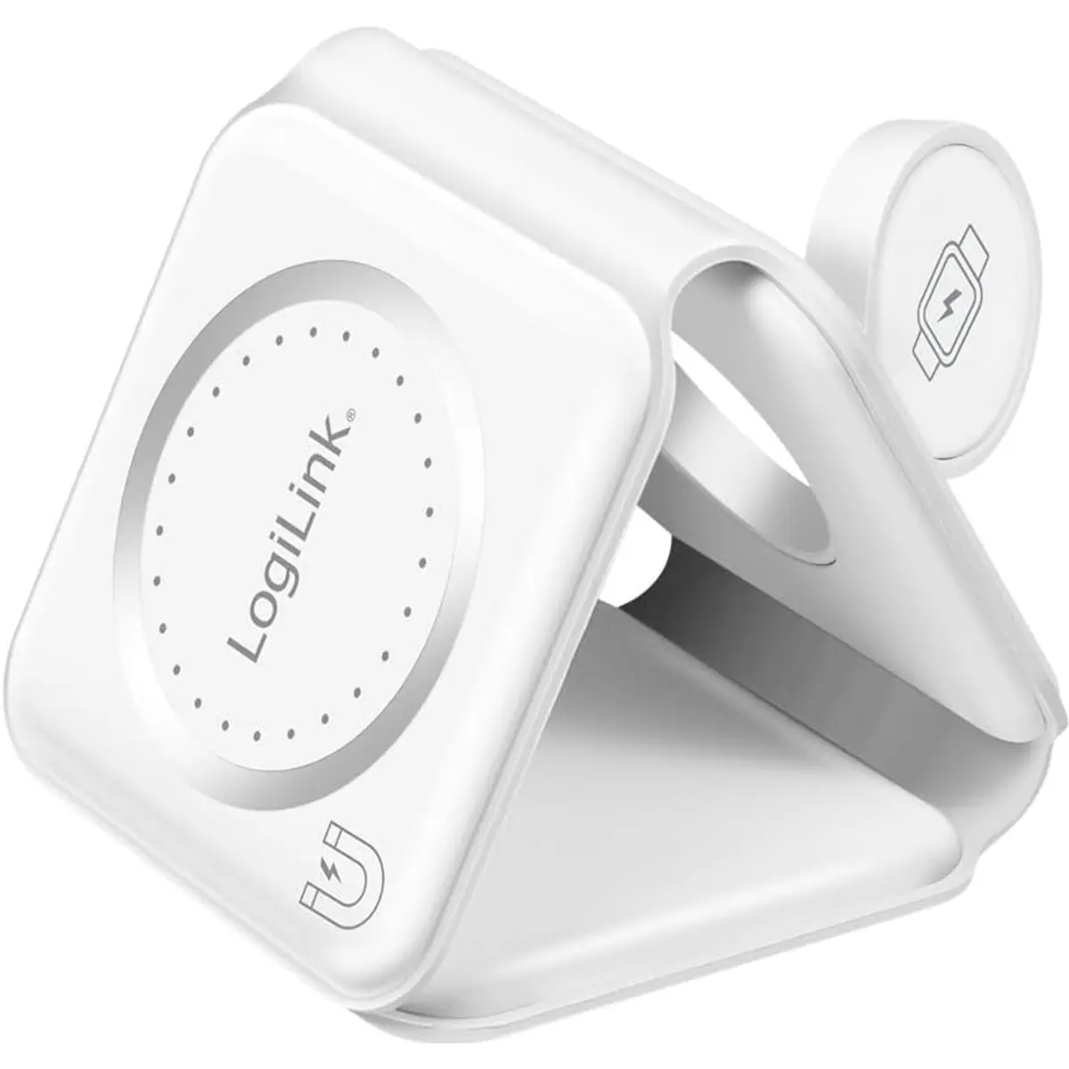 A estação de carregamento sem fios 3 em 1 PA0344 da LogiLink é uma solução prática, compacta e dobrável, para carregar simultaneamente o iPhone (com MagSafe), o Apple Watch e os AirPods. Compatível com a tecnologia Qi e equipada com ímanes fortes e precisos, garante um posicionamento magnético ideal e carregamento estável.