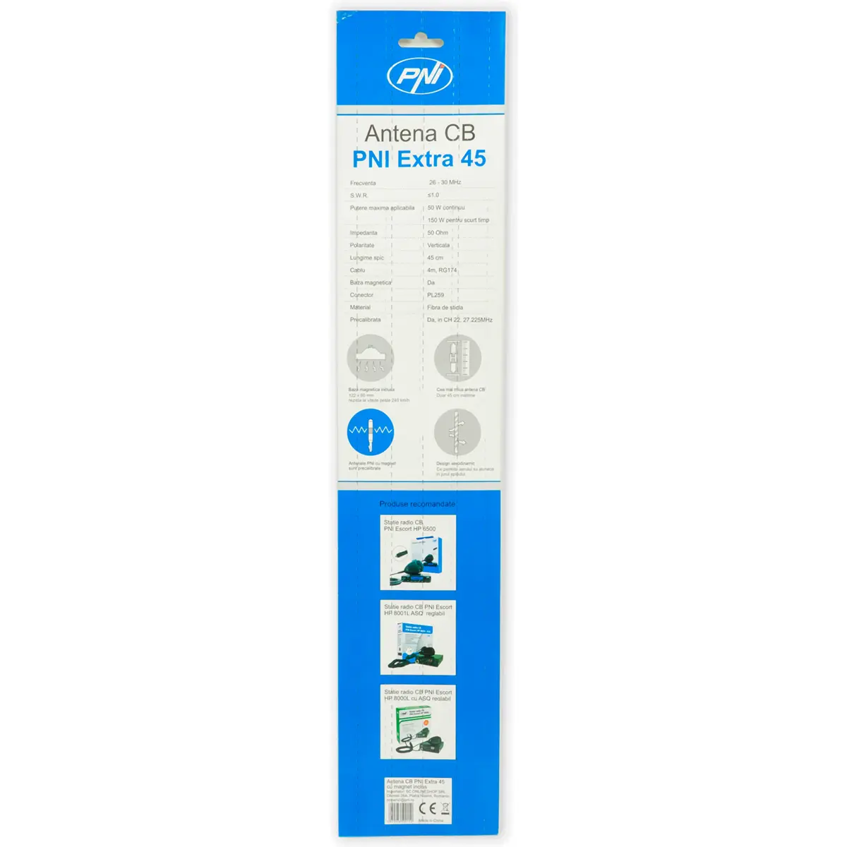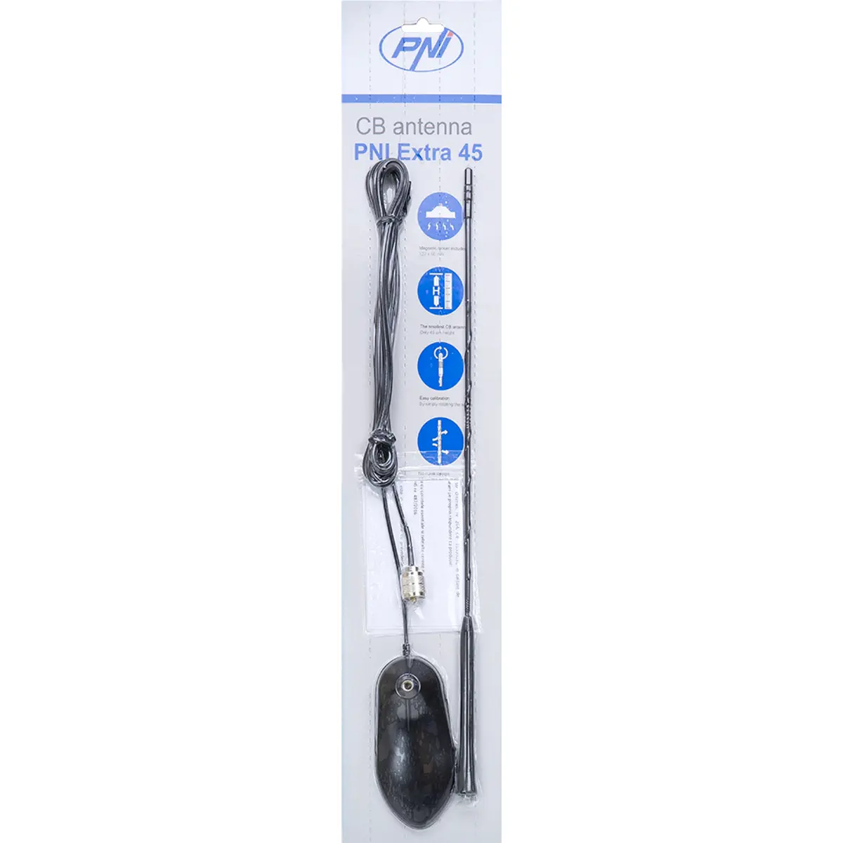 A PNI Extra 45 é uma antena CB compacta e eficiente, com apenas 45 cm de altura, ideal para instalação discreta em automóveis, carrinhas ou mini-autocarros. Devido ao seu tamanho reduzido e design discreto, pode facilmente ser confundida com uma antena de rádio convencional.