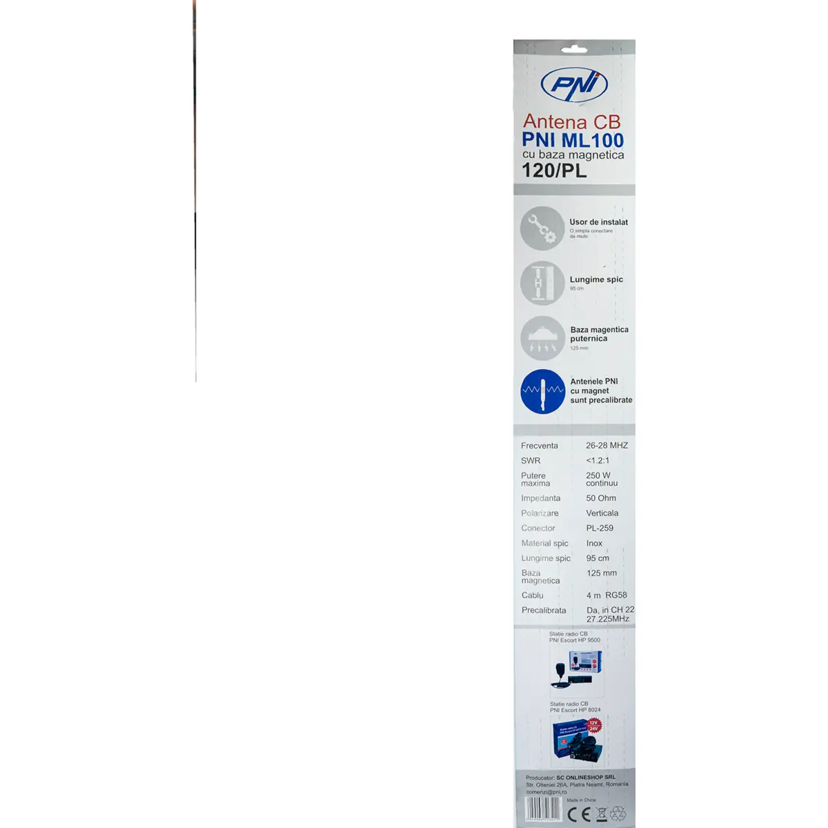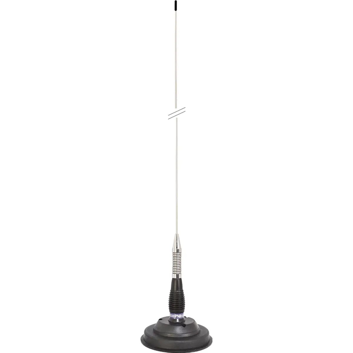A antena CB PNI ML100 destaca-se pelo seu elevado desempenho, graças às suas características técnicas robustas e construção em aço inoxidável. Com um comprimento de 100 cm (110 cm com base magnética incluída), esta antena garante excelente capacidade de comunicação em campo aberto, alcançando até 12 km em condições ideais.
