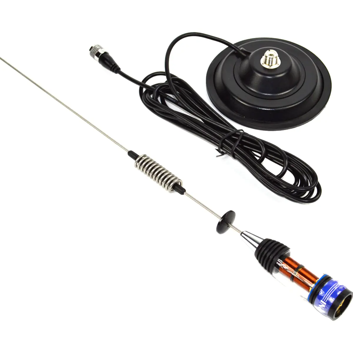 Antena CB compacta para viaturas com base magnética, comprimento total de 70 cm, banda de operação 26–28 MHz e impedância de 50 Ohm. Oferece ganho de 4 dBi, potência máxima de 200 W e SWR ≤ 1.2. Inclui cabo RG58 de 4 m e ficha PL259 para montagem rápida. Ideal para comunicação móvel, com alcance até 8–9 km em campo aberto. Construção em aço inoxidável e funcionamento entre -26 °C e +60 °C, resistente a condições externas.