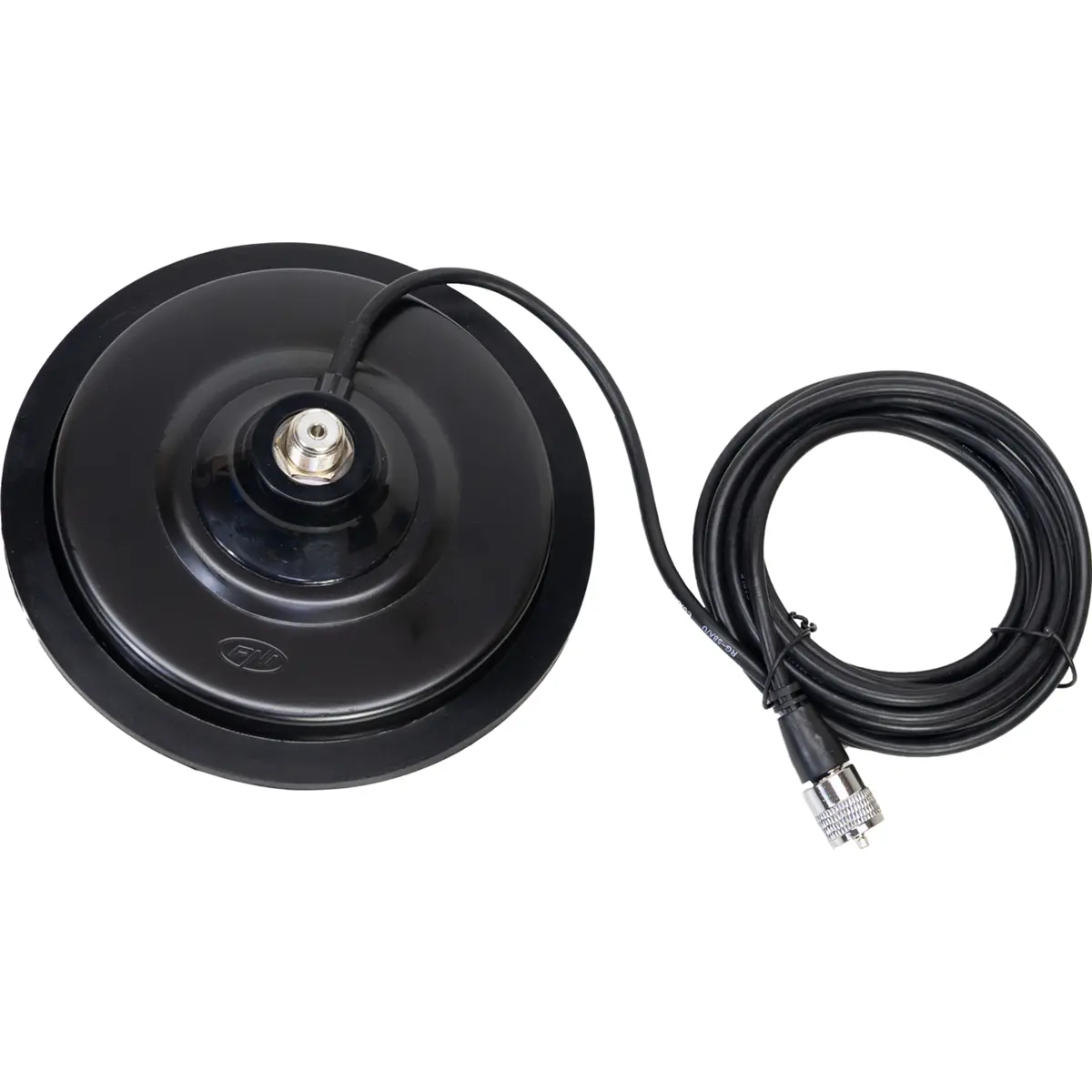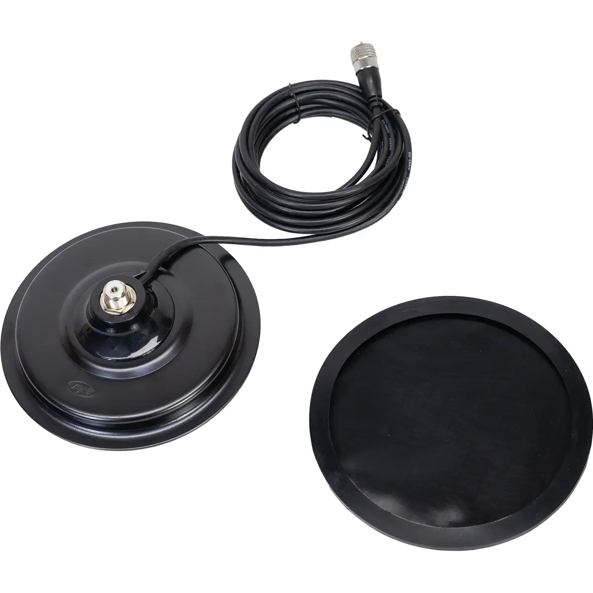 Base magnética para antenas CB com rosca interna (PL), diâmetro da base 170 mm e ficha PL259 integrada, ideal para instalação estável em viaturas ligeiras, camiões e frotas comerciais. Inclui cabo coaxial RG58 de 4 m com baixa perda e ligação direta à estação de rádio. A base possui borracha protetora que preserva a pintura e evita infiltrações de água, suportando velocidades até 200 km/h e oferecendo durabilidade em condições de condução intensas.