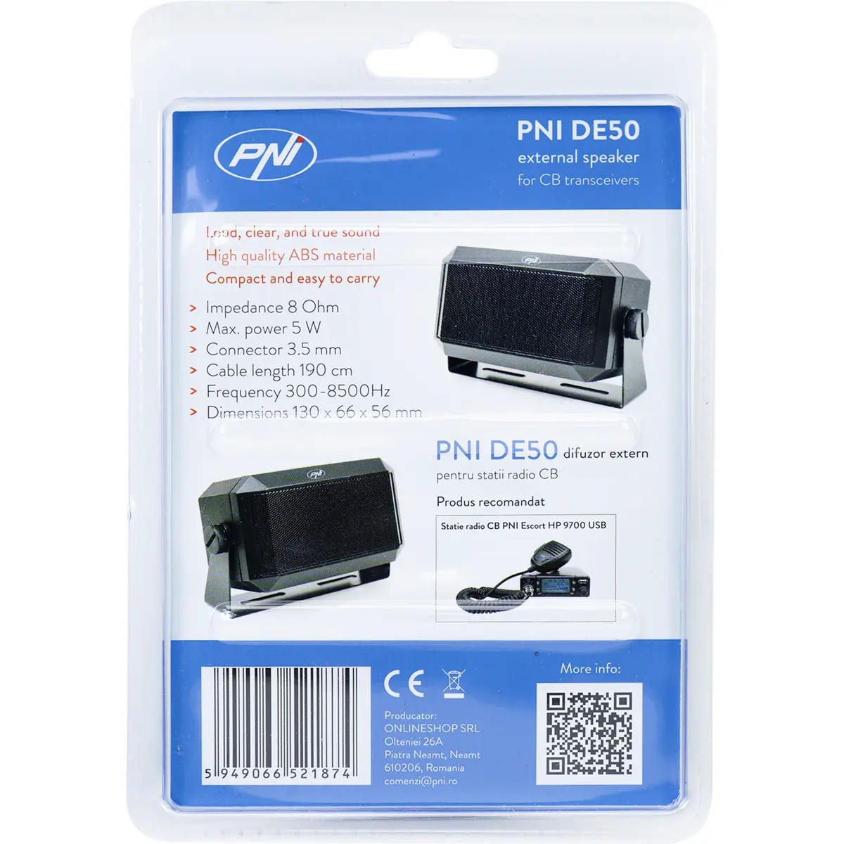 O altifalante externo PNI DE50 pode ser ligado a qualquer estação móvel ou portátil equipada com saída áudio de 3,5mm. Possui uma potência máxima de 5W, garantindo som claro e potente. O cabo de 1,9 m permite a instalação em qualquer local, sem comprometer a segurança na condução do veículo.