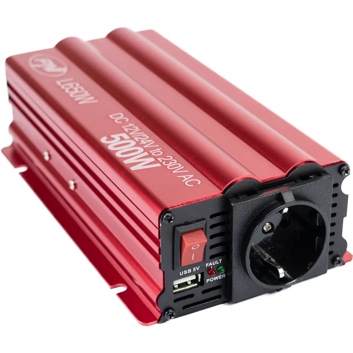 O inversor de corrente PNI L650W é uma solução versátil para alimentar dispositivos eléctricos em veículos com alimentação de 12V ou 24V. Equipado com uma tomada de saída de 230V (onda modificada) e uma porta USB de 5V/500mA, permite o funcionamento de pequenos equipamentos com carga resistiva, como televisores, rádios, ventiladores ou carregadores, bem como o carregamento de smartphones e tablets. Inclui protecções contra sobreaquecimento, curto-circuito, sobrecarga e bateria descarregada. Recomendado apenas para aparelhos com consumo compatível com a onda modificada. A potência máxima de 500W é garantida apenas com ligação direta à bateria do veículo com o motor ligado.