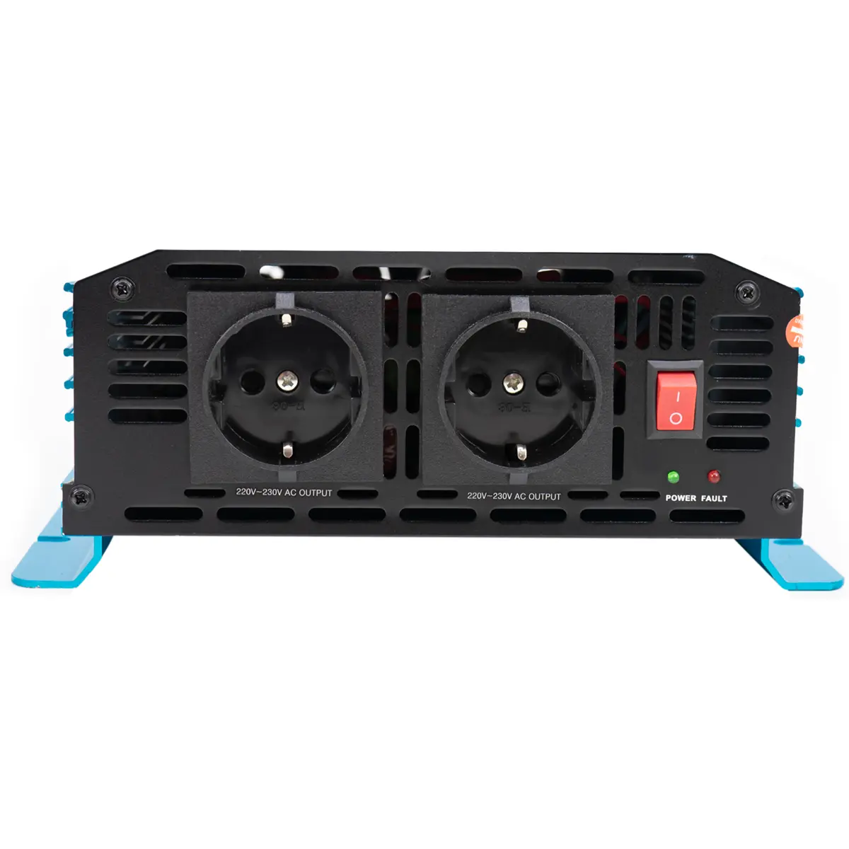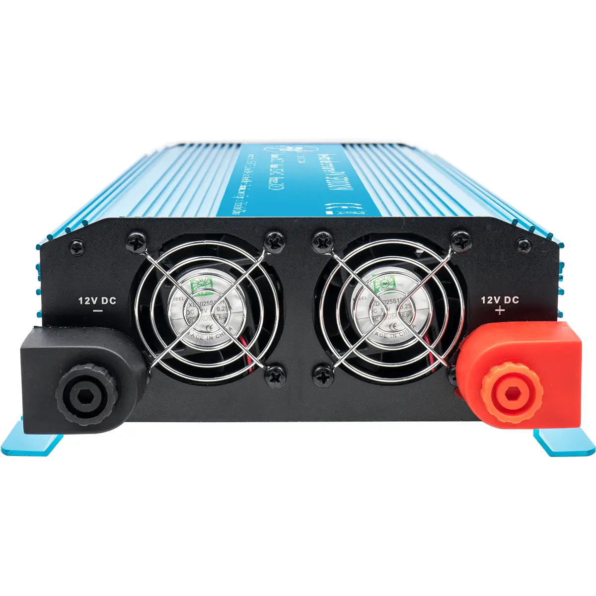 Inversor de tensão que transforma 12V DC em 220V AC com onda sinusoidal pura, fornecendo 2000 W de potência contínua e até 4000 W de pico, a 50 Hz. Possui eficiência superior a 88%, consumo em stand-by de 10-15 W, arrefecimento ativo com ventoinha e proteções contra sobrecarga, térmica e curto-circuito. Equipado com duas tomadas de saída 230V, apresentado em dimensões de 440 x 226 x 90 mm e peso de 4,27 kg, adequado para veículos e sistemas autónomos.