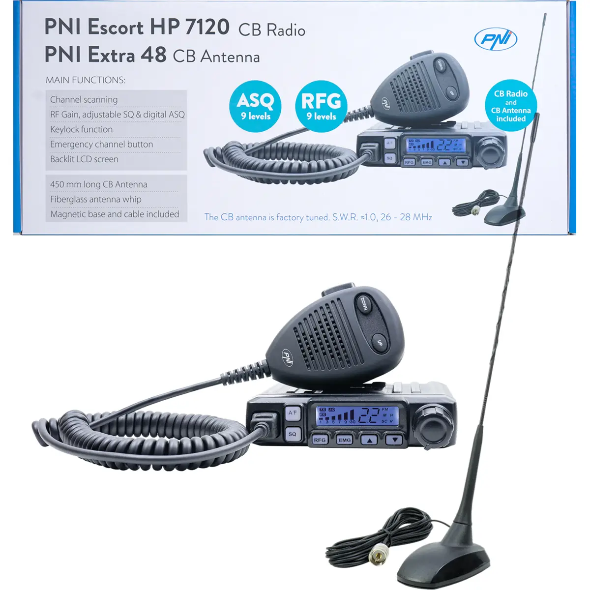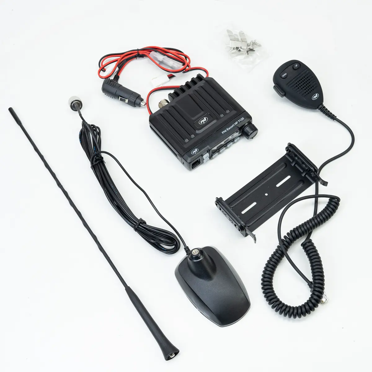 Este conjunto inclui a estação de rádio CB PNI Escort HP 7120 e a antena CB PNI Extra 48 com base magnética. Ideal para uma instalação discreta em veículos ligeiros ou comerciais, combina excelente desempenho de transmissão e receção com dimensões compactas e facilidade de utilização.