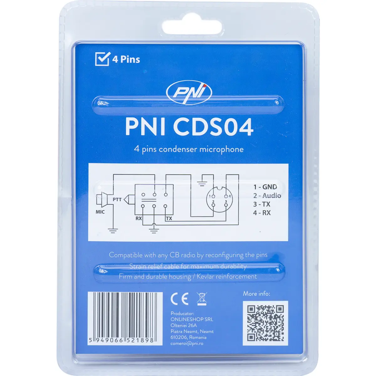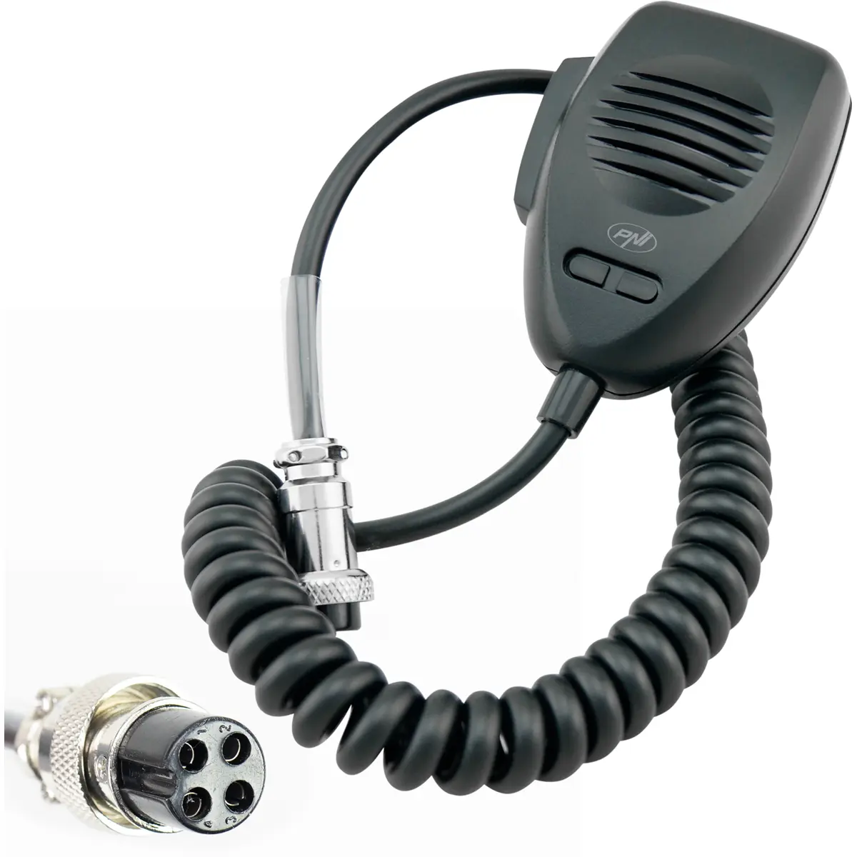 O microfone PNI CDS04 é um microfone electret robusto e fiável, concebido com um corpo resistente e cabo reforçado com material tipo Kevlar para maior durabilidade. É compatível com qualquer estação CB através de reconfiguração de pinos e funciona diretamente com a estação Midland Alan 100 sem necessidade de modificações.