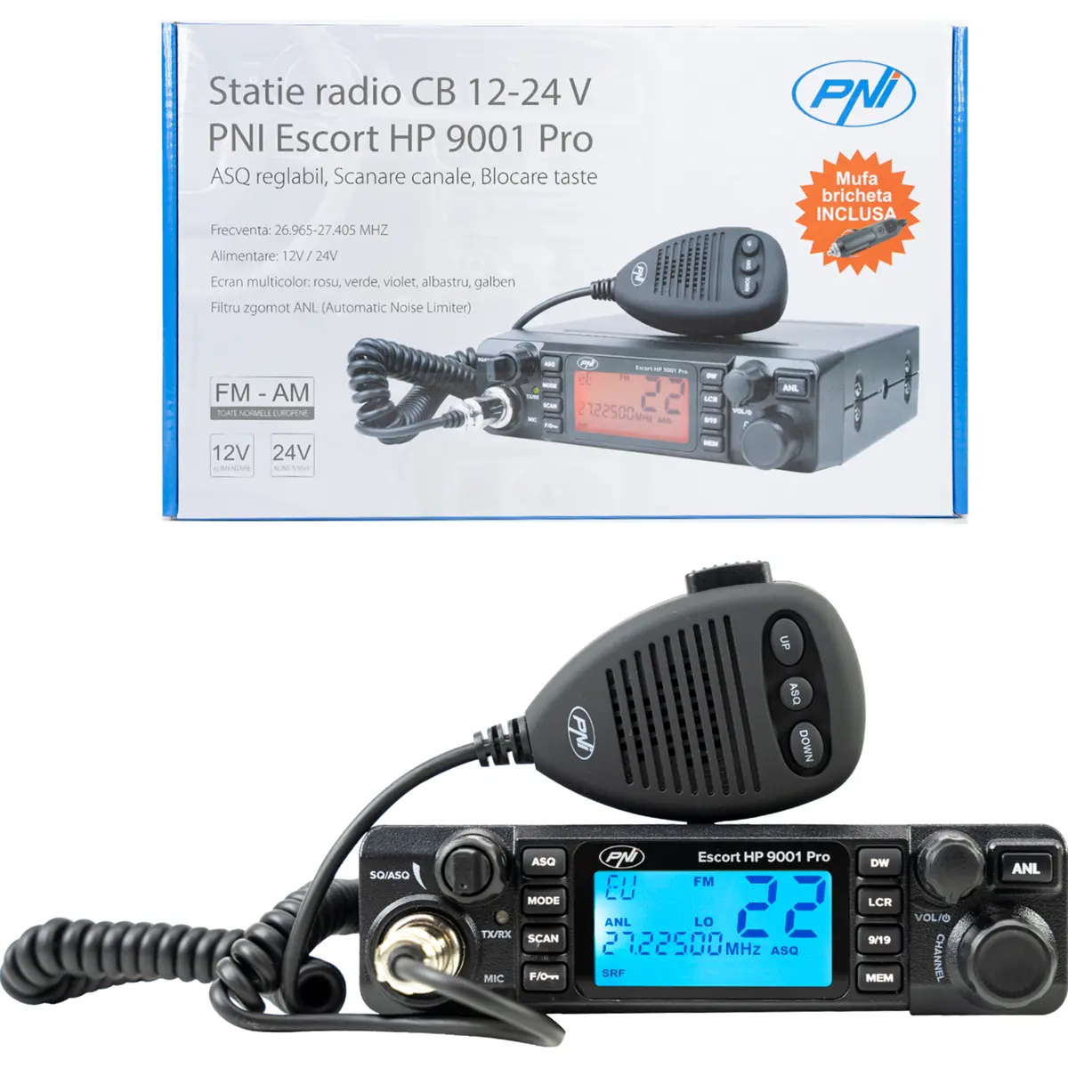 PNI Escort HP 9001 PRO - Estação de rádio CB Dual Watch c/ ecrã multicor 4W AM-FM 40CH 12-24Vdc