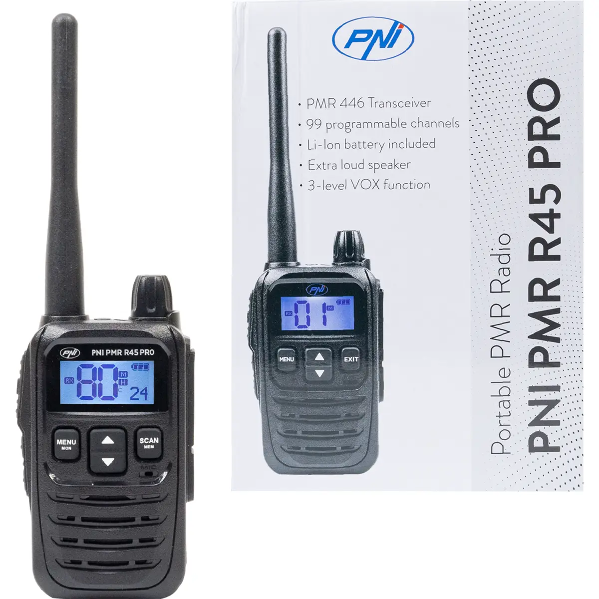 A PNI PMR R45 Pro é uma estação rádio portátil de uso livre (PMR446) ideal para comunicação em ambientes como montanha, construção, segurança privada ou logística. Com um funcionamento simples (pressionar e falar), oferece 32 canais PMR, VOX mãos-livres, e várias funções profissionais que garantem privacidade, fiabilidade e alcance até 8 km.