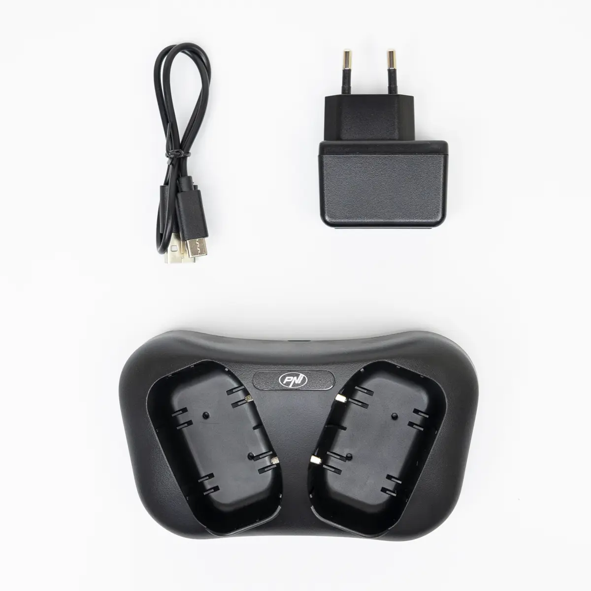 O conjunto inclui duas estações, dois suportes de cinto, duas baterias recarregáveis, carregador de secretária duplo e cabo USB-C. É compatível com pilhas AA (alcalinas ou Ni-MH) e dispõe de ecrã LCD com várias indicações de estado.