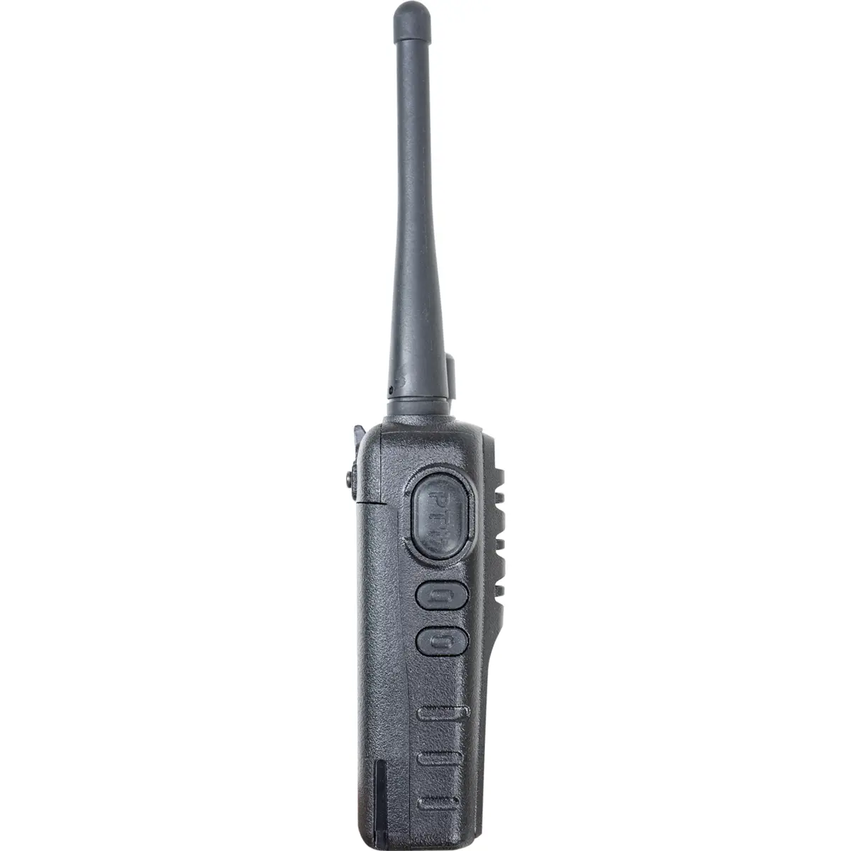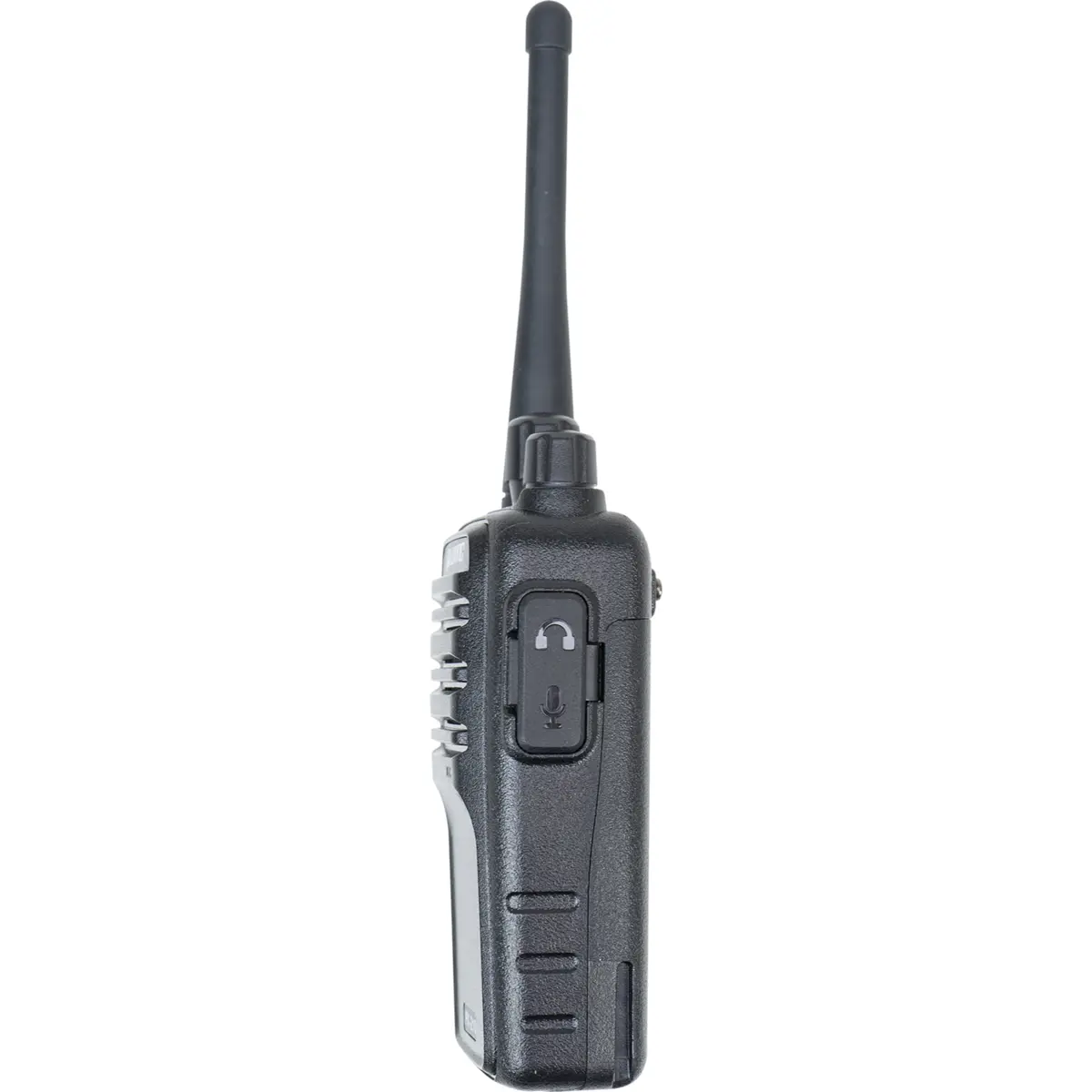 Comunicação sem licença em PMR446 (446 MHz) com 16 canais, 12,5 kHz de passo, 0,5 W de emissão e alcance típico até 10 km, dependendo do terreno. Ideal para uso pessoal ou profissional em exteriores, estaleiros, edifícios e ambientes empresariais. Inclui VOX, menu por voz, monitorização de canal, códigos DCS e CTCSS, Time Out Timer, varredura de canais e economia de energia automática. Pode ser programado via software (kit de programação vendido separadamente). Alimentação por bateria Li-Ion 7,4 V, 1200 mAh, com base de carregamento, funcionamento entre -26°C e +80°C, peso 189 g, dimensões compactas.