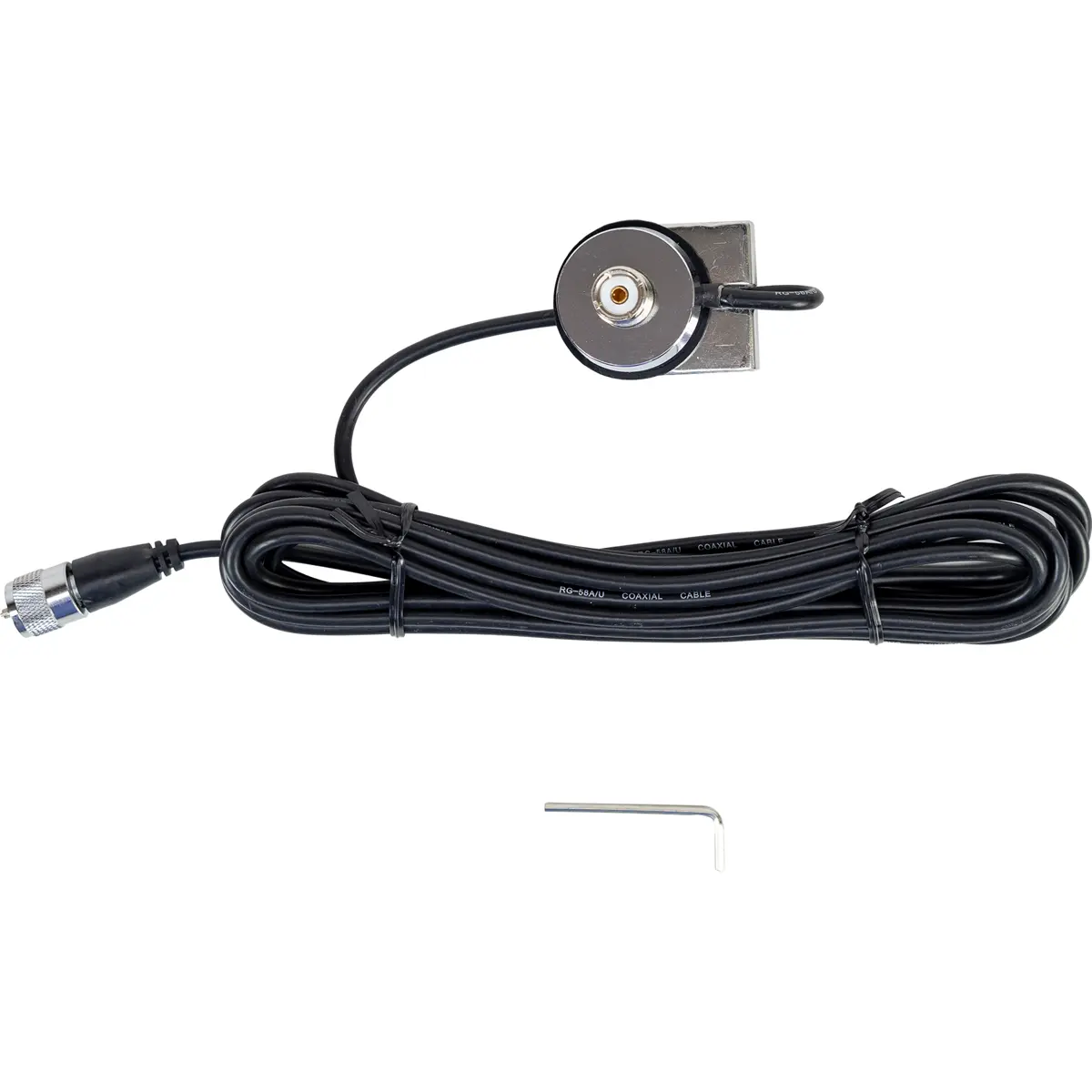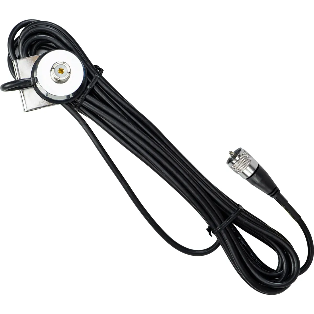 Compatível com antenas com rosca PL, o suporte é fornecido com cabo coaxial RG58 de alta qualidade, com 5 metros de comprimento, permitindo a ligação entre a antena montada na mala e a estação CB no interior do veículo.