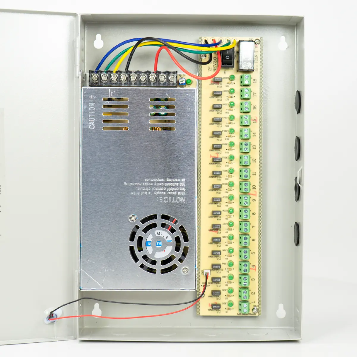 Fonte de alimentação para sistemas CCTV com 18 saídas independentes e caixa metálica, concebida para operar de forma estável e fiável. Inclui ventoinha de arrefecimento, proteção contra curto-circuito e montagem fixa em interiores. Oferece ingresso universal 110–220V AC, frequência 50–60 Hz e saída estável de 12V DC com até 30 A (360 W). Funciona em faixas de temperatura de -26°C a +80°C, ideal para ambientes residenciais, comerciais ou industriais e para alimentação de câmaras de vigilância.