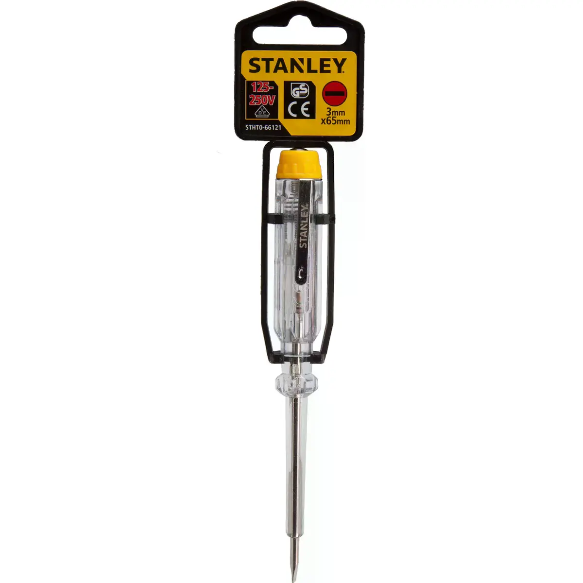 O Busca-Pólos STANLEY de 3 mm x 65 mm permite testes de segurança em qualquer parte de um circuito elétrico de até 250 V MÁX. Em conformidade com as normas VDE, GS e CE.