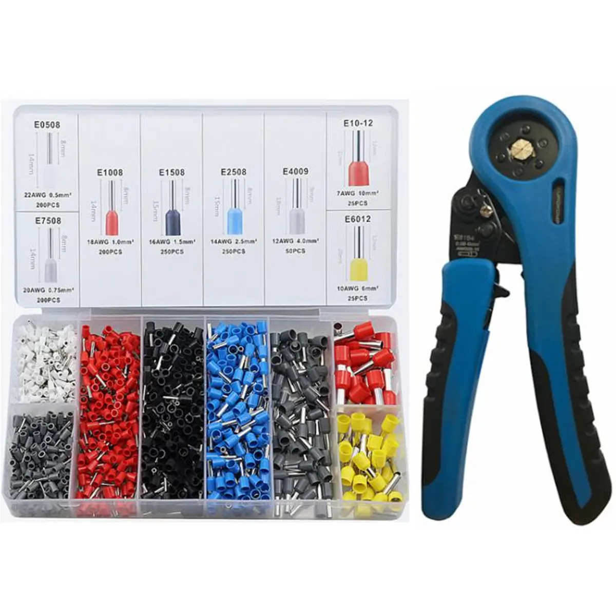 Conjunto de 1200 ponteiras isoladas (0.06-10mm²) com alicate de cravar hexagonal [6 lâminas]