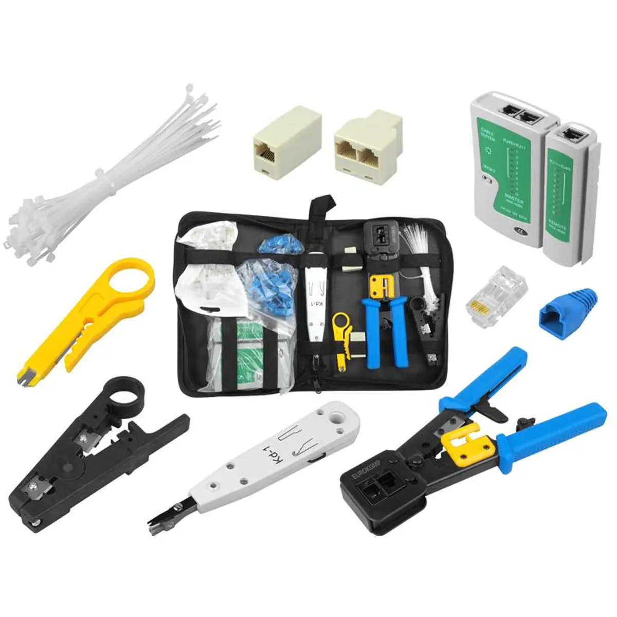 Este conjunto de ferramentas de rede é ideal para instalação e manutenção de redes LAN, incluindo tecnologia Pass Through. O sistema Pass Through permite passar todos os fios pelo conector, garantindo alinhamento uniforme e um corte preciso do excesso após o cravamento. Isto assegura uma conexão mais fiável e profissional em comparação com cravamento tradicional. Inclui todas as ferramentas essenciais para montar e testar cabos de rede com conectores RJ45, RJ12 e RJ11.