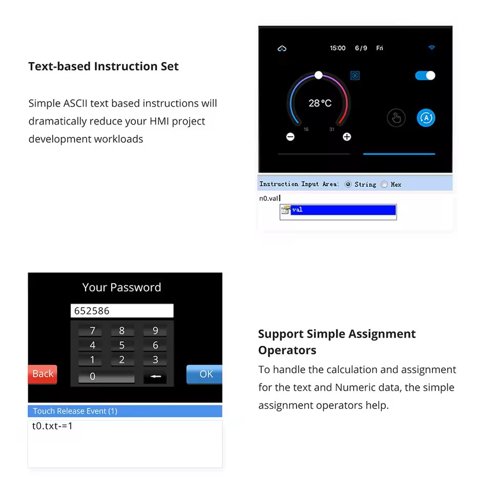 ● Nextion Editor: componentes WYSIWYG, codificação por eventos, simulador, comandos operacionais e instruções ASCII simples